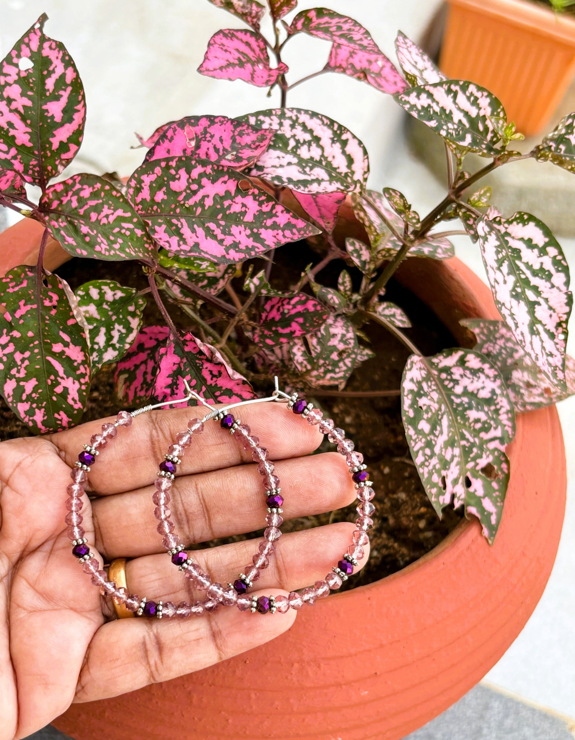 These elegant handmade large hoop earrings feature a beautiful two-toned design with wire-wrapped lavender and deep purple rondel beads for a sophisticated statement look. Sold as a single pair.
