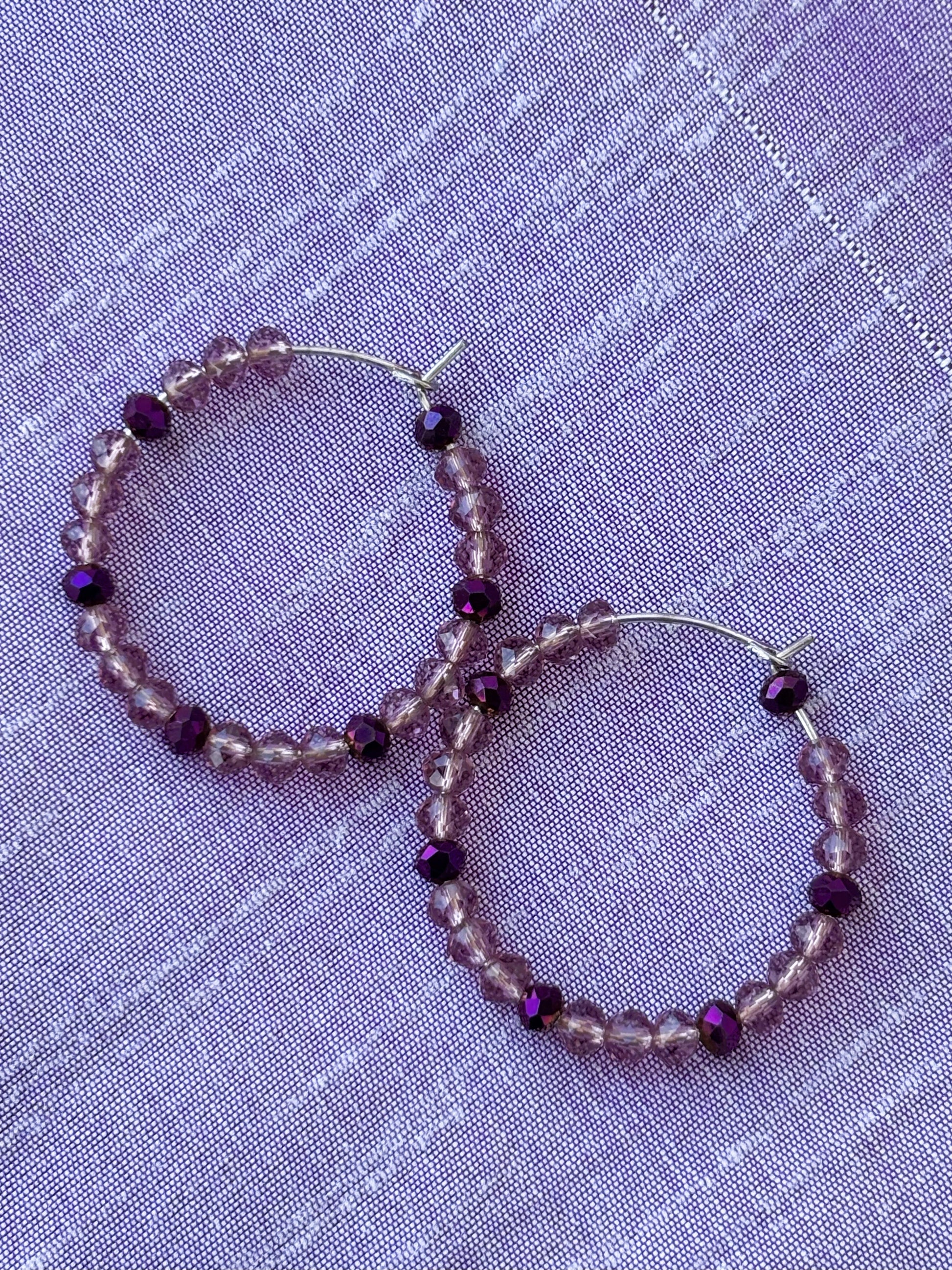 These elegant handmade hoop earrings feature a beautiful two-toned design with wire-wrapped lavender and deep purple rondel beads for a sophisticated pop of color. Sold as a single pair.