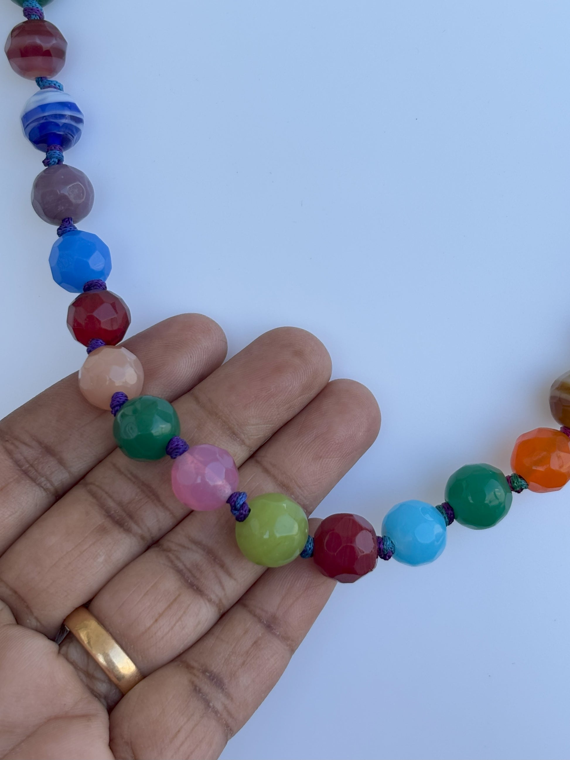 A vibrant handmade necklace featuring genuine multi-color agate beads and an adjustable cord for a perfect, colorful statement. Sold as a single piece. Necklace length 20 inches in total with adjustable chord.