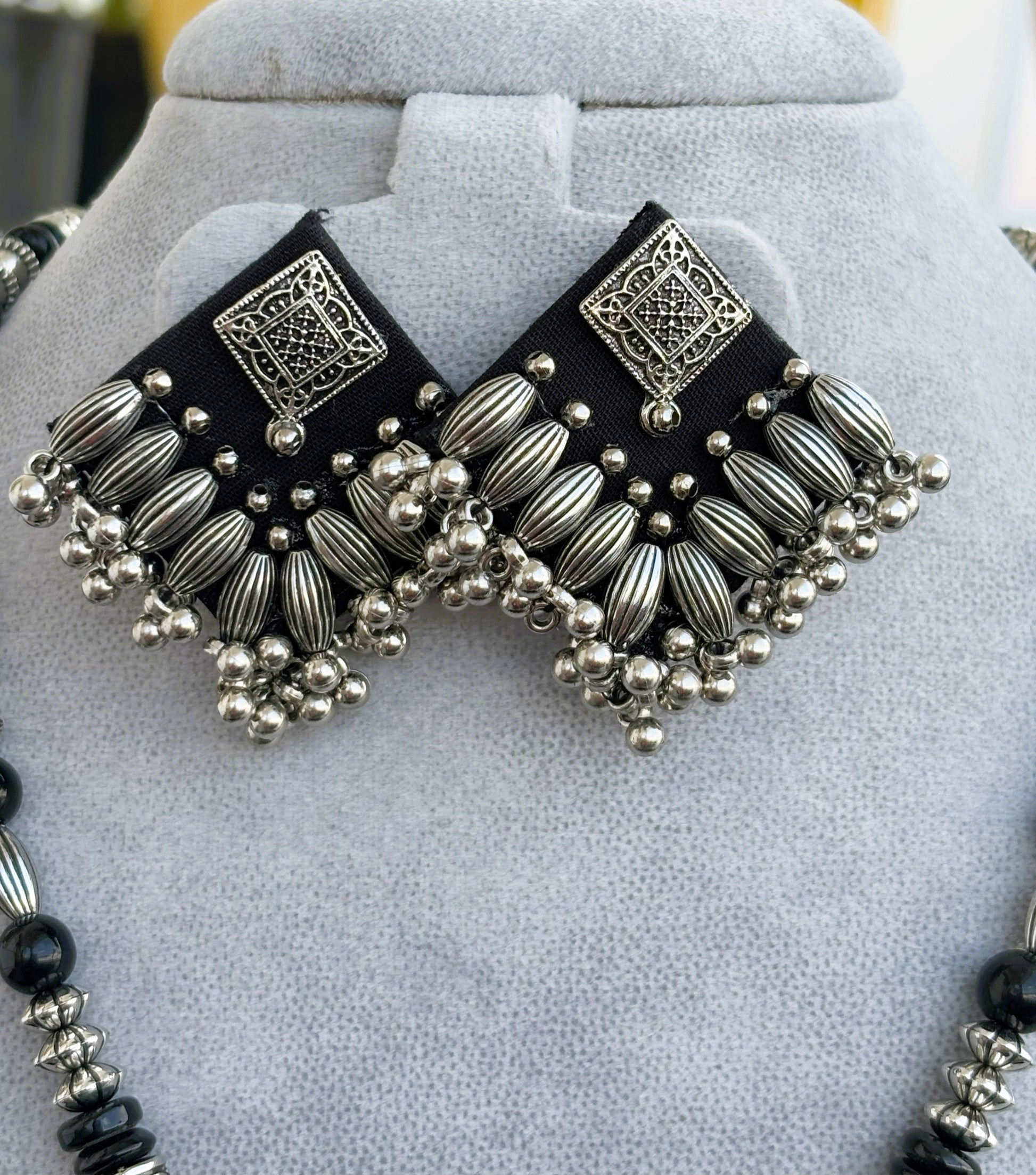 A striking handmade oxidized silver jewelry set featuring a detailed flute player pendant on a beaded necklace with matching earrings. Sold as a single piece. Necklace length 22 inches in total. Pendant height 4 inches.