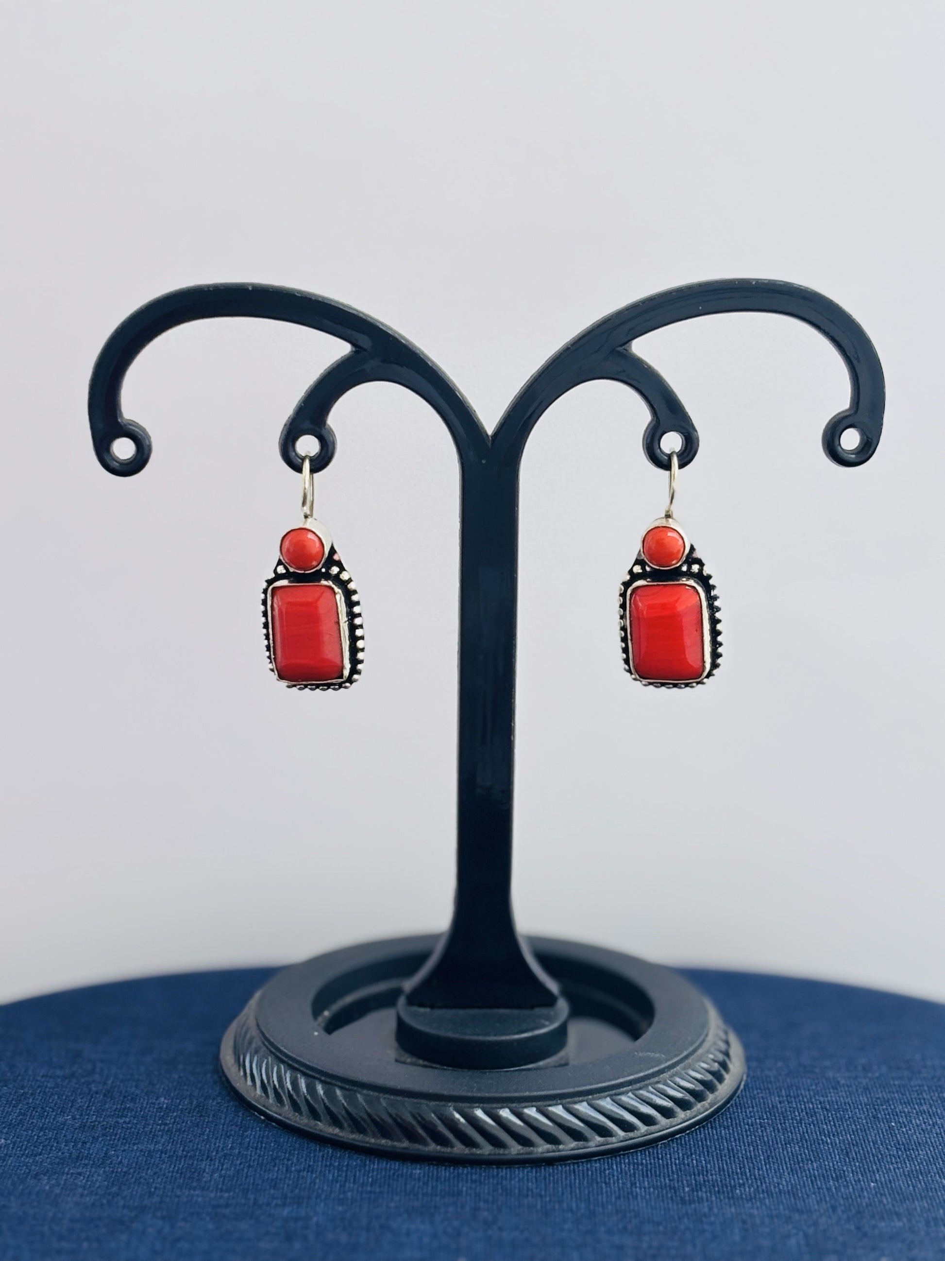 A beautiful pair of handmade dangle earrings featuring vibrant red coral stones set in an oxidized silver bezel with a beaded texture. Sold as a single pair.