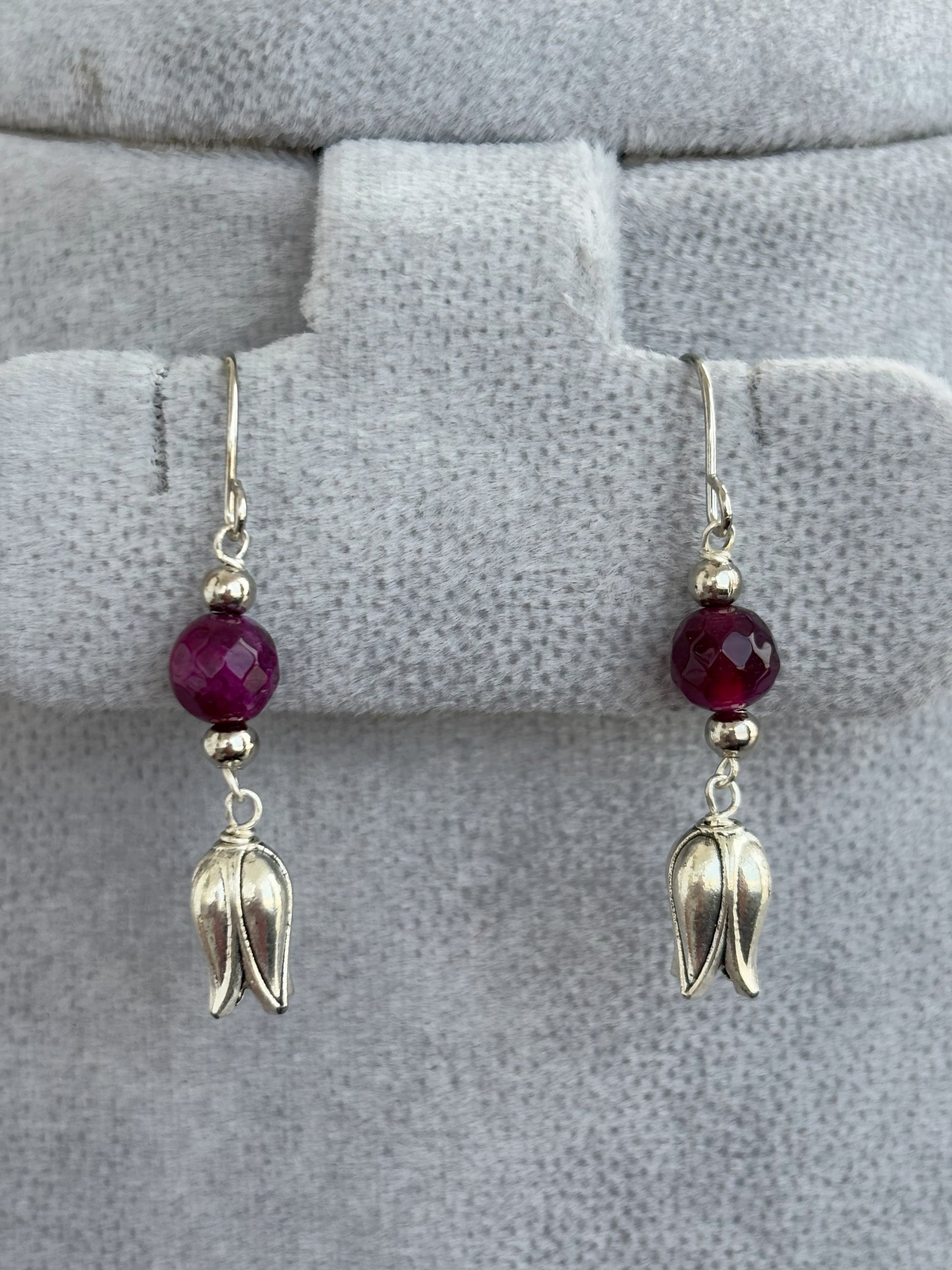 A beautiful handmade jewelry set featuring semi-precious magenta stones and unique oxidized metal tulip beads on a delicate chain with matching earrings. Sold as a single piece. Necklace length 22 inches in total.