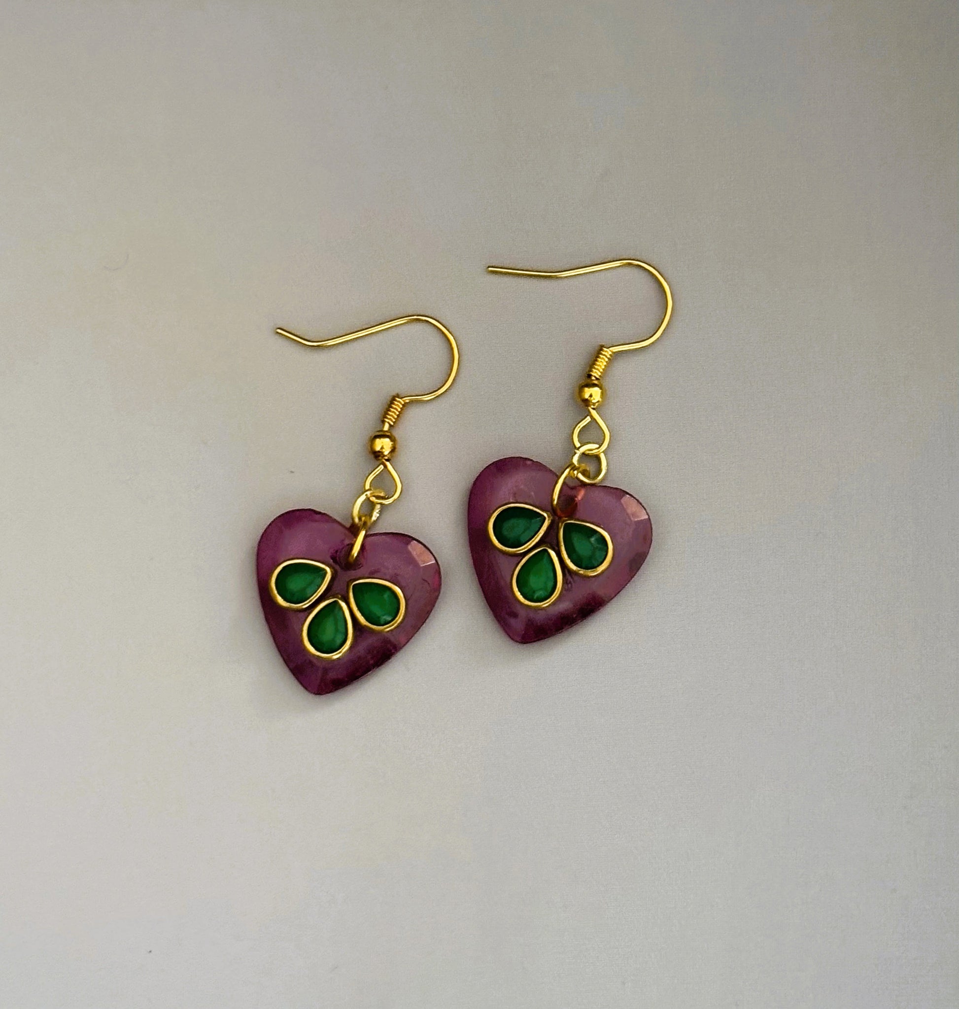Handmade Pink Heart Earrings with Green Kundan Stones