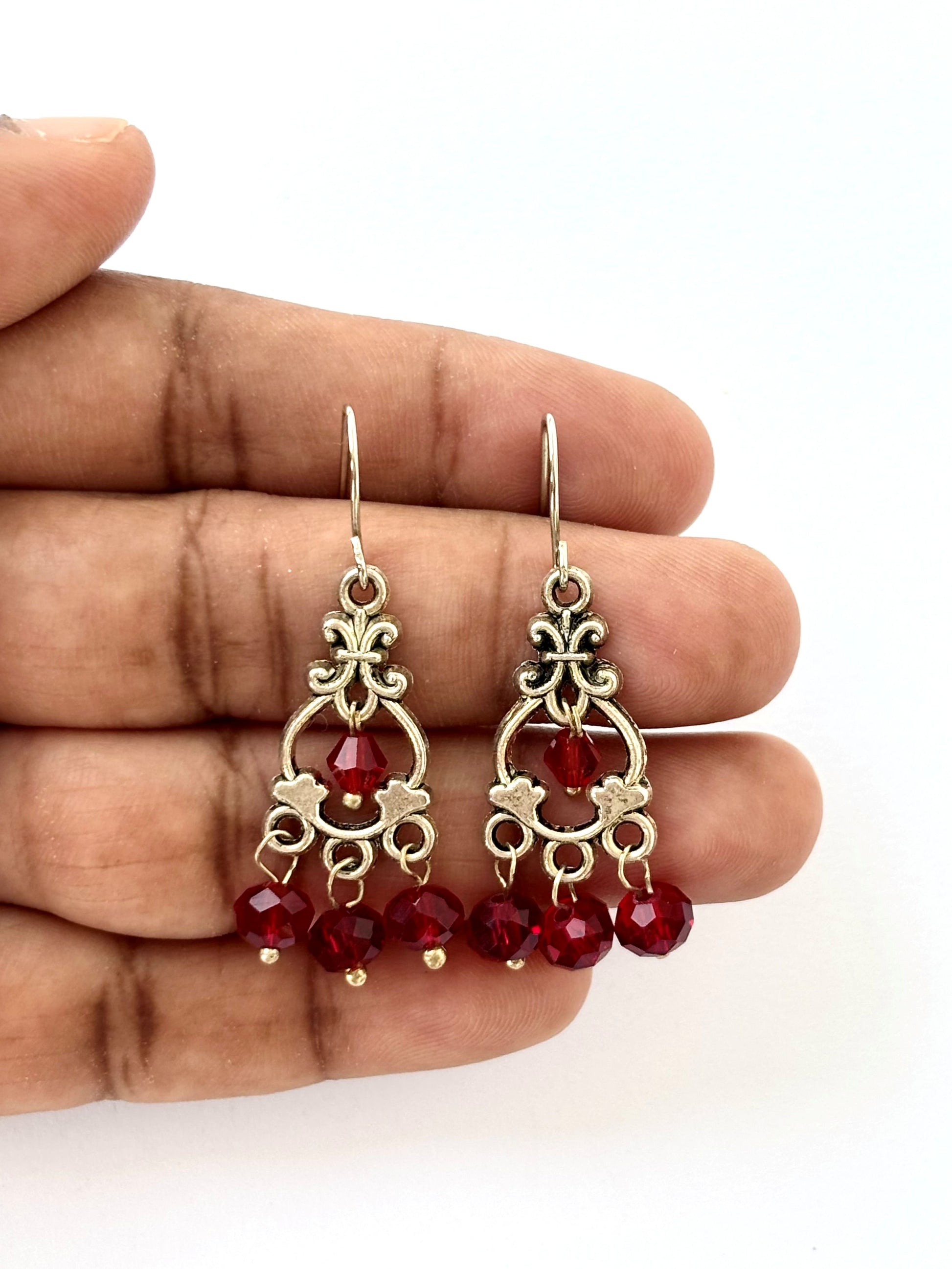 Handmade chandelier earrings featuring a decorative silver-tone filigree charm with a cascade of faceted red crystal beads. Sold as a single pair.
