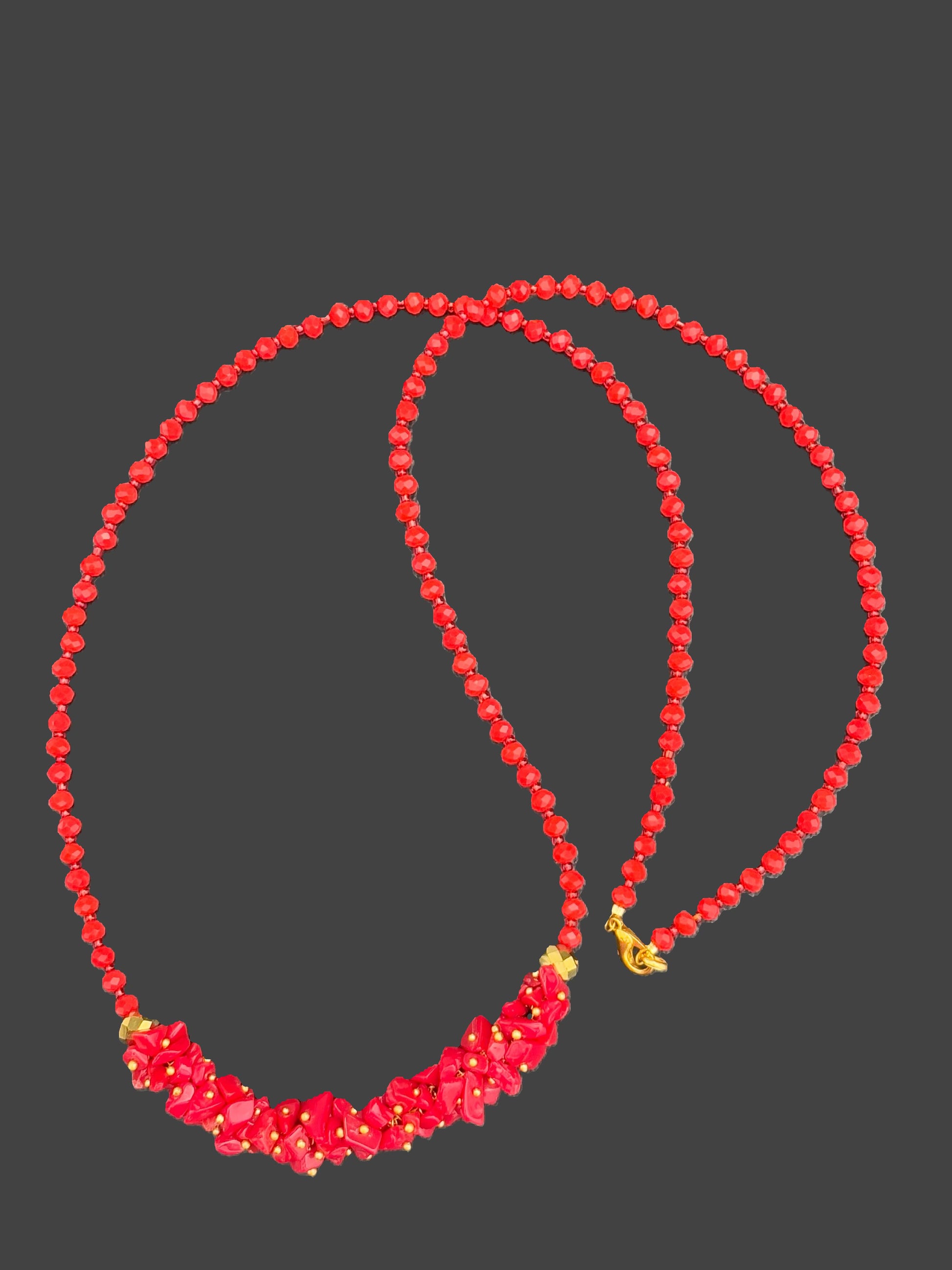 A beautiful handmade necklace featuring a central cluster of semi-precious red chip beads and gold-tone charms on a beaded strand. Sold as a single piece. Necklace length 28 inches in total.