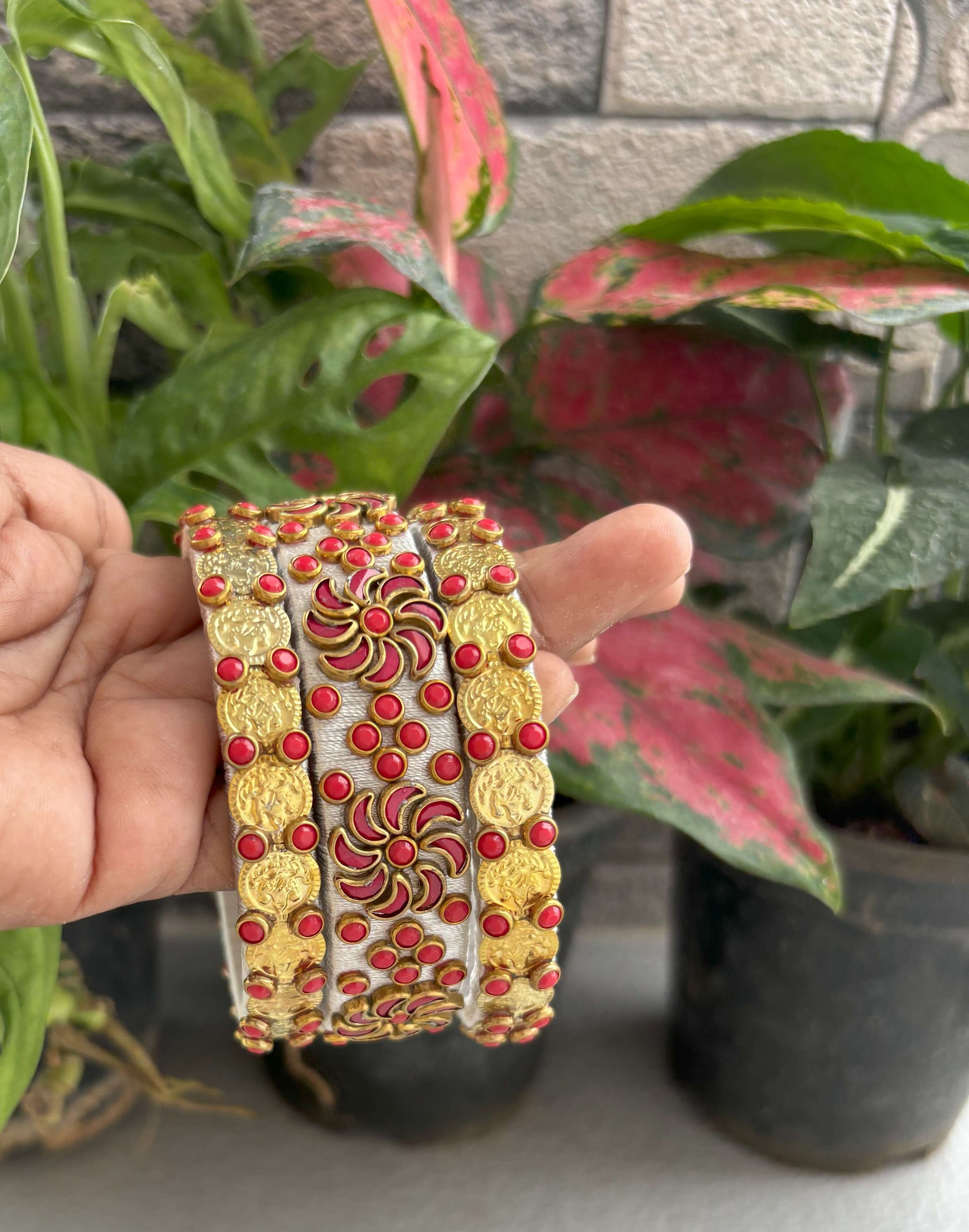 Handmade Silver Silk Thread Bangle Set with Gold Kasu Coins