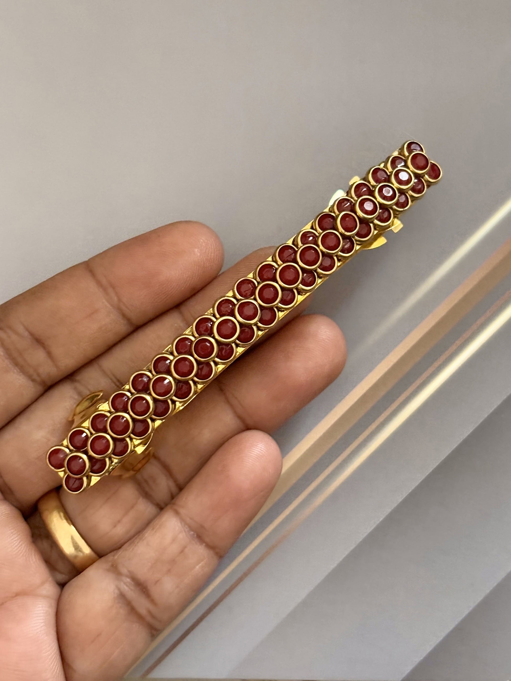 This elegant handmade hair clip features a gold-tone base adorned with two rows of small, circular terracotta red kundan stones for a timeless ethnic look. Sold as a single piece.