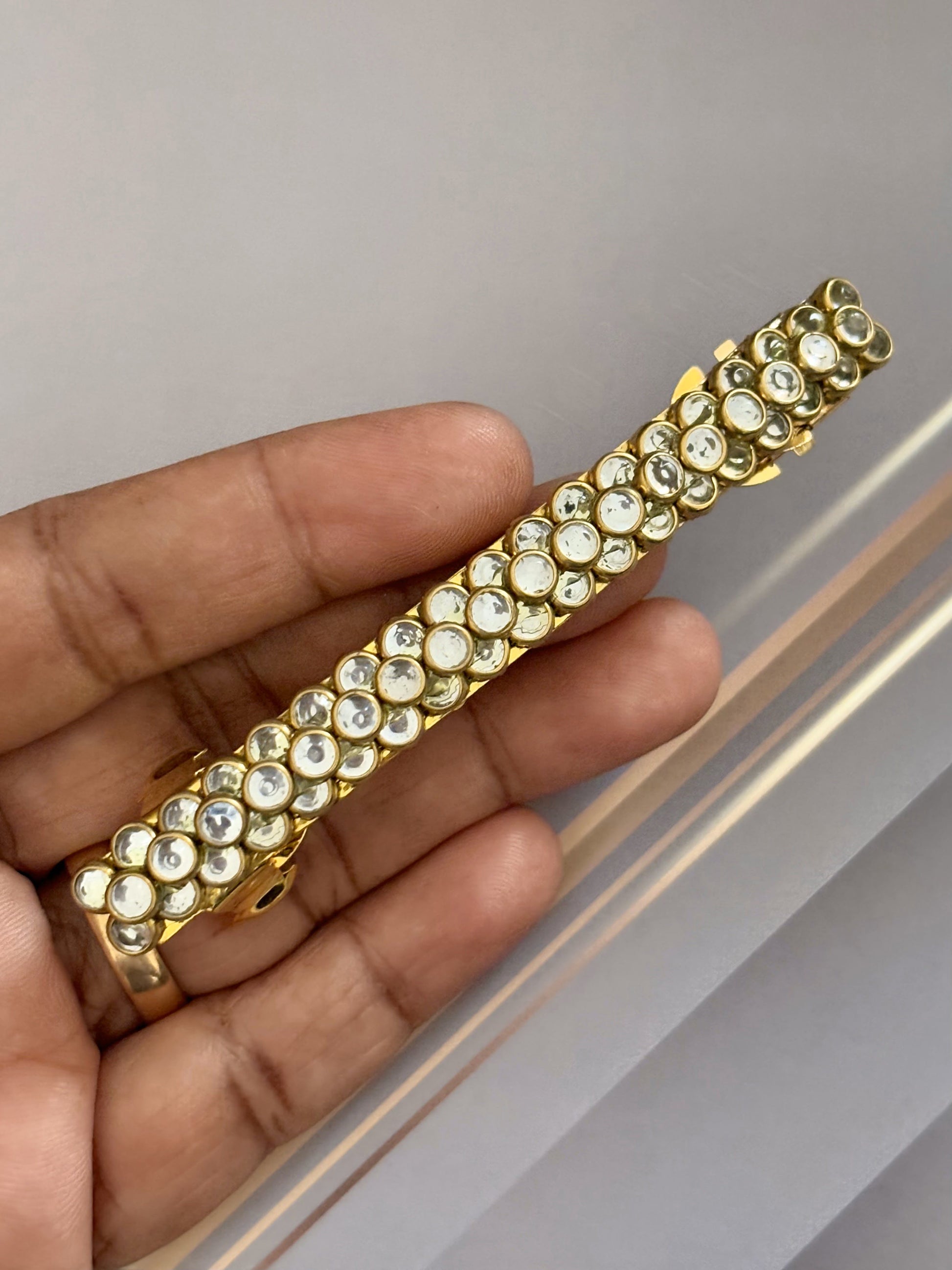 This elegant handmade hair clip features a gold-tone base adorned with two rows of sparkling clear kundan stones, perfect for a classic ethnic look. Sold as a single piece.