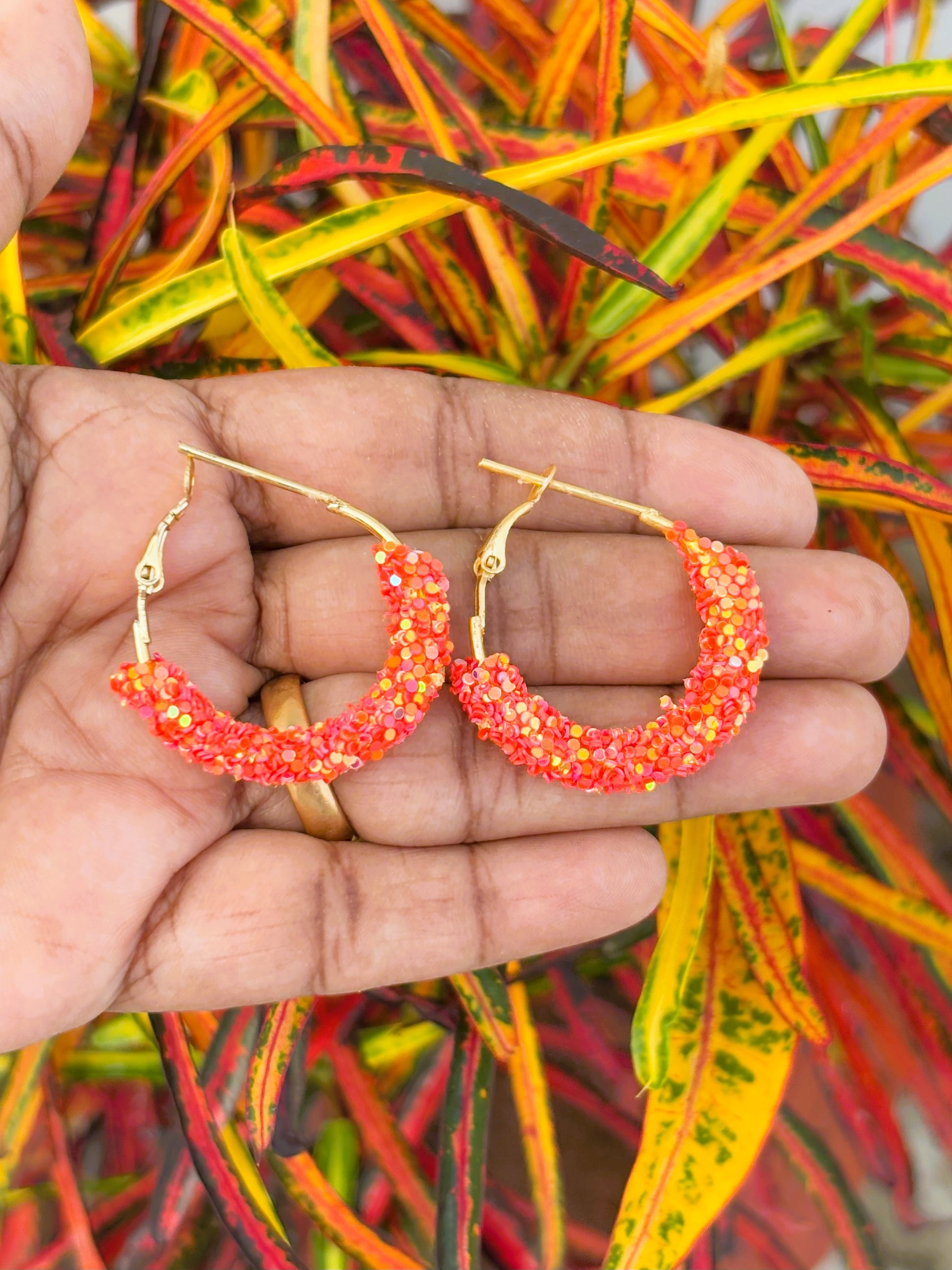 These vibrant handmade hoop earrings feature a glittering pave design of orange, creating a stunning and sparkling statement piece. Sold as a single pair.