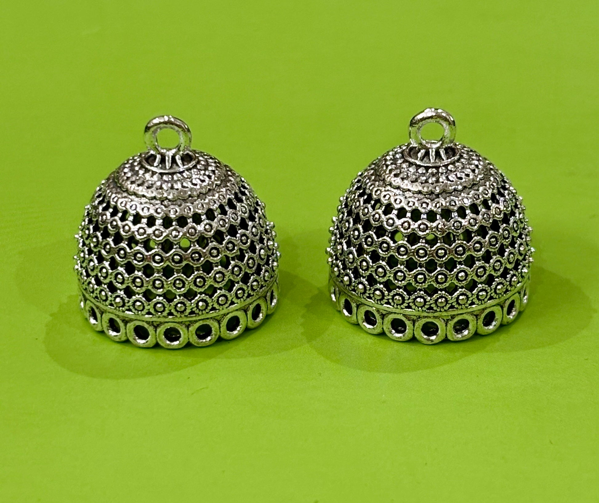 Pair of antique silver-tone jhumka earring bases with intricate concentric circular patterns and floral detailing,. Pack of two pieces.