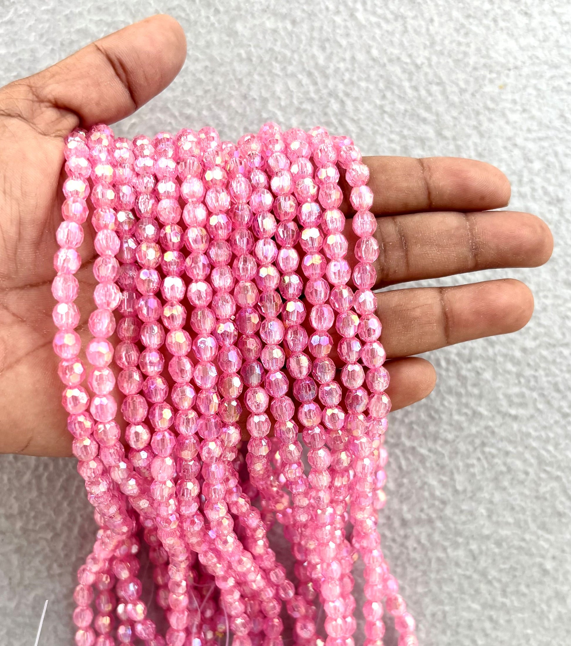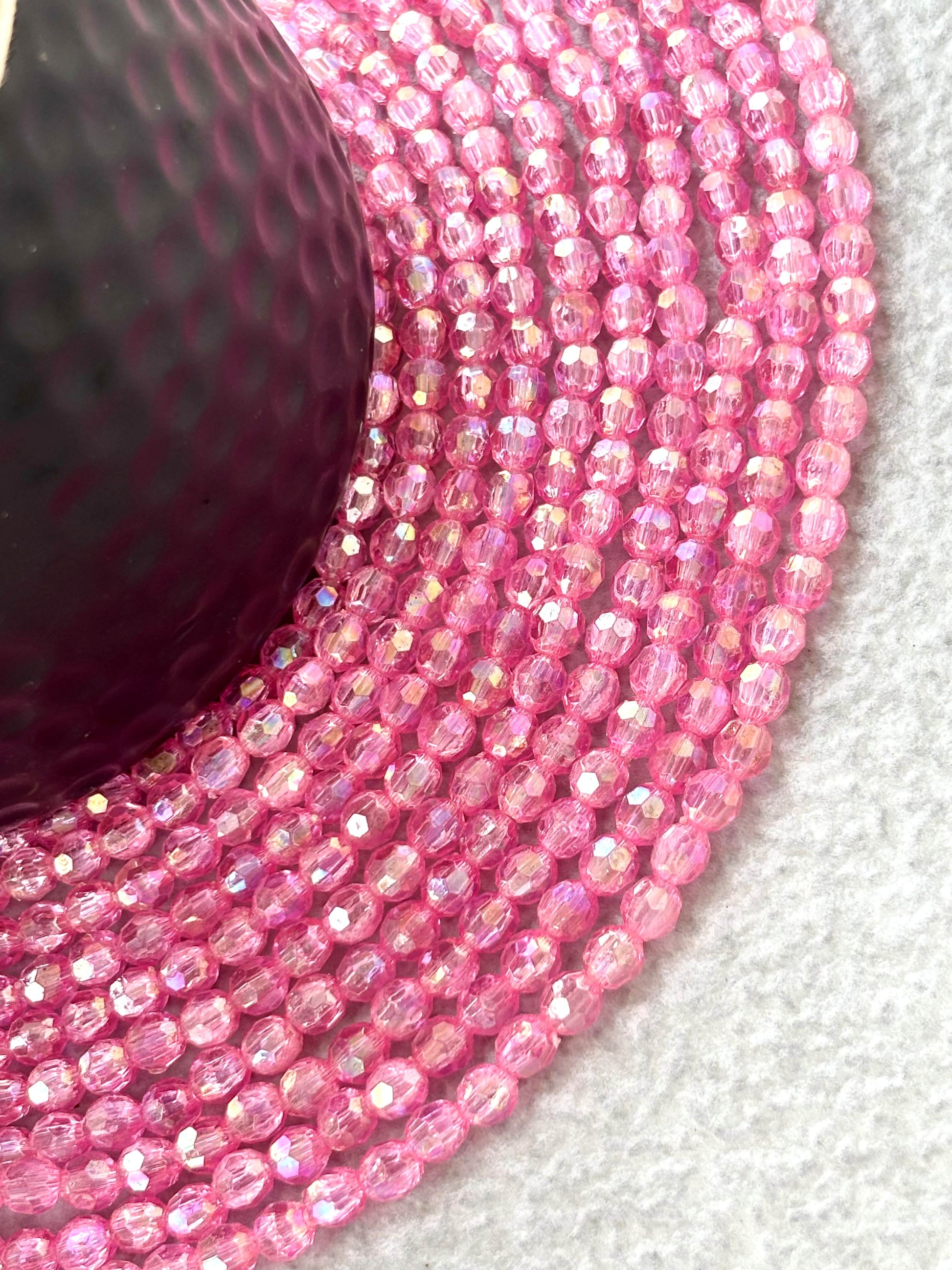 Discover vibrant hot pink faceted oval beads with a captivating iridescent finish, perfect for adding dazzling sparkle to your jewelry and craft projects. Size 5x6MM. Sold by single strand measuring 15 inches with 67 beads approximately.