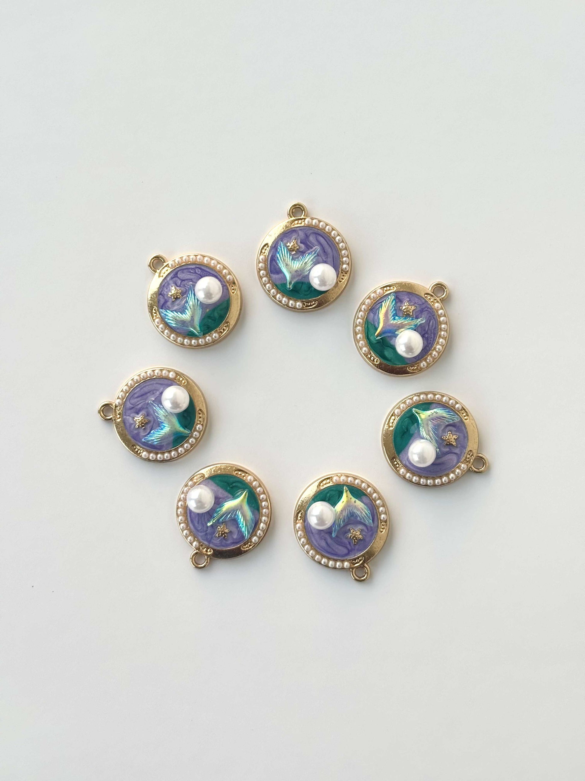 Luxurious circular enamel charms with an iridescent mermaid tail, white pearl, and gold star in a pearl-bordered frame. Pack of single charm.