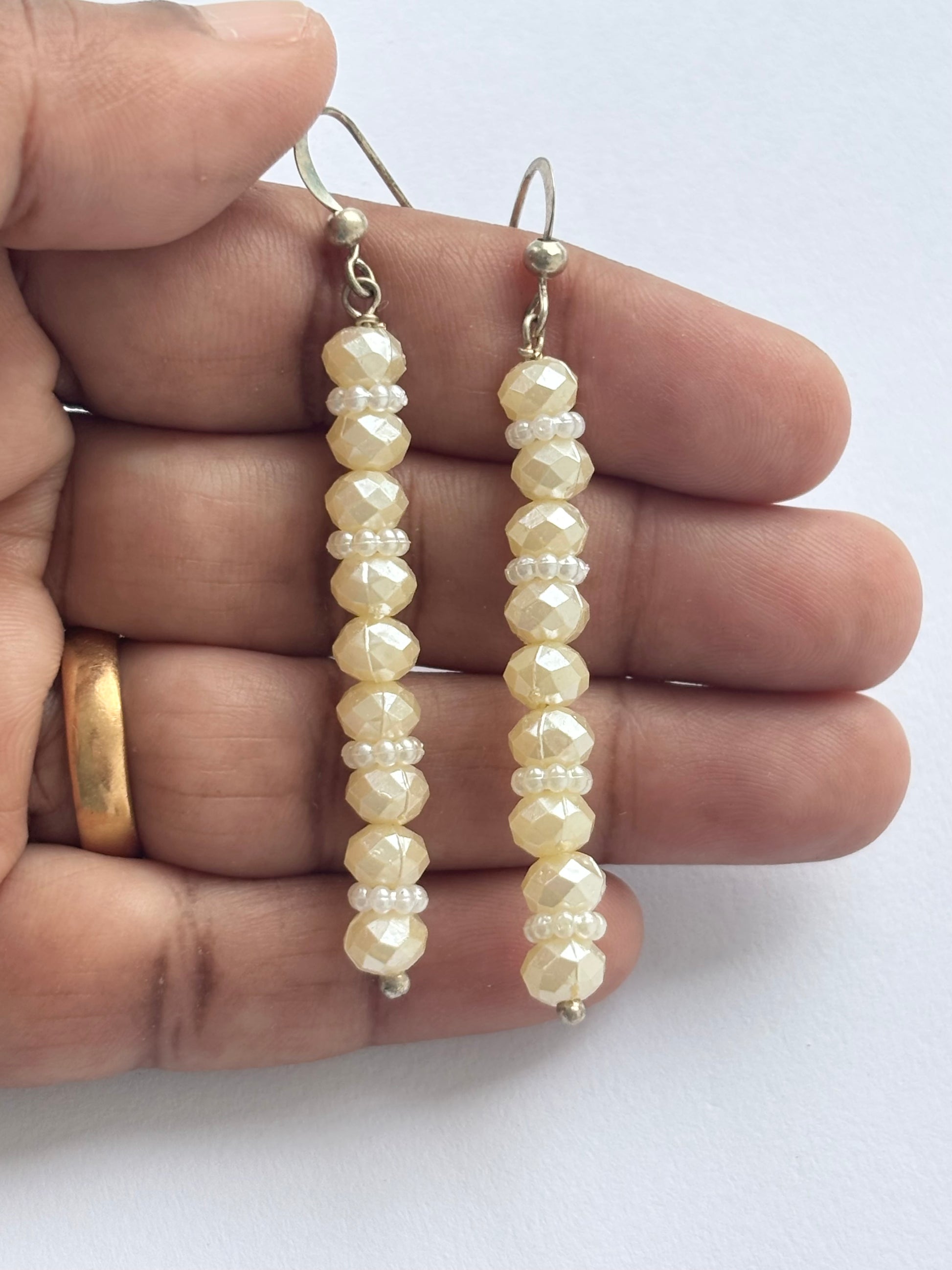 These delicate handmade earrings feature a classic combination of ivory-colored crystals and small pearl beads for a timeless look. Sold as a single pair.