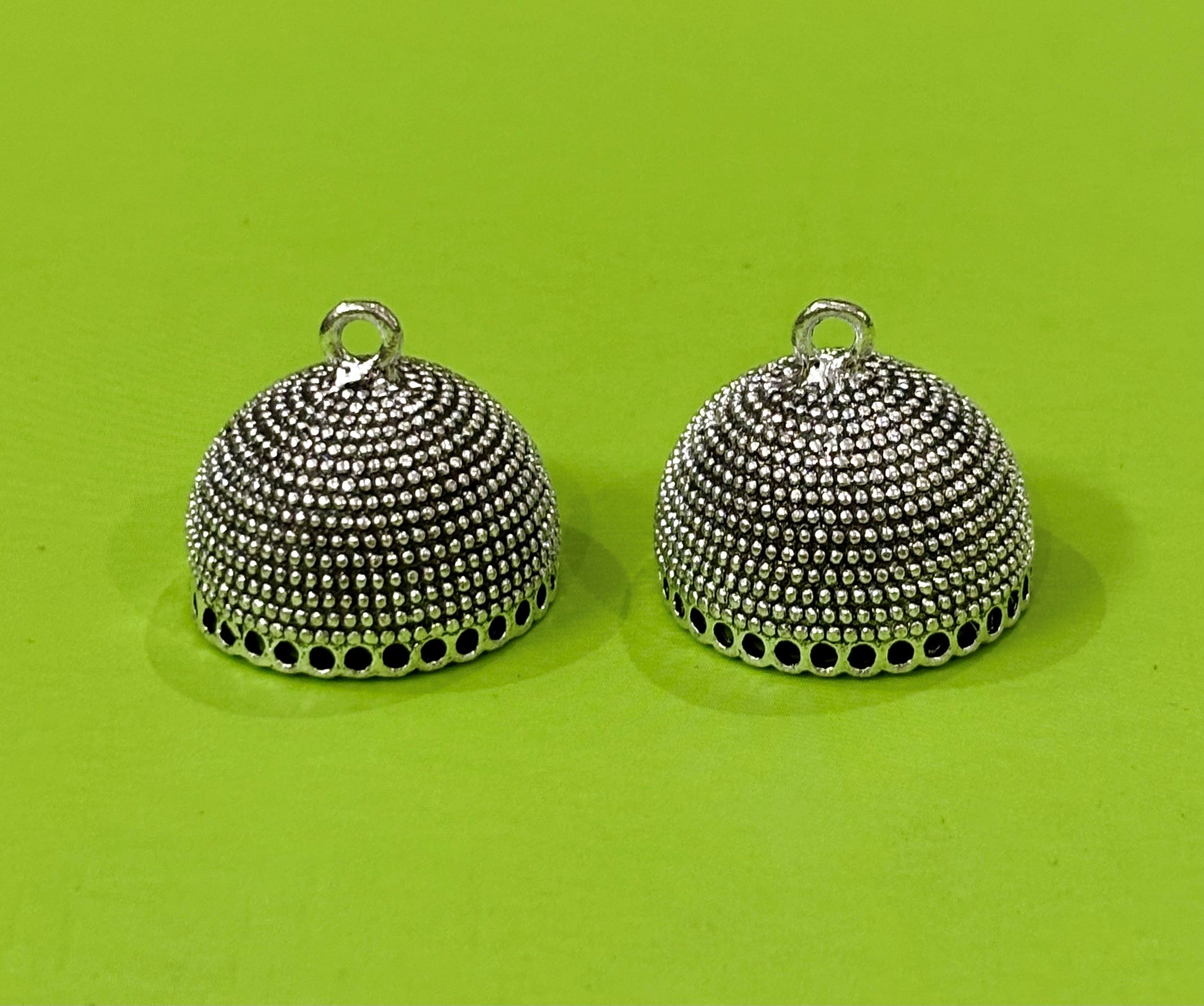 Pair of oxidized silver-tone jhumka earring bases featuring a classic dome shape with fine dotted texture in concentric rings. Pack of two pieces.