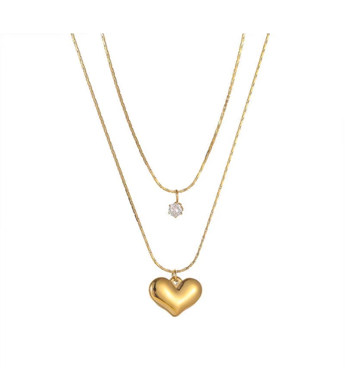 This chic layered gold-toned necklace, featuring a puffy heart pendant and a single crystal charm, is a trendy and versatile accessory inspired by Korean fashion.