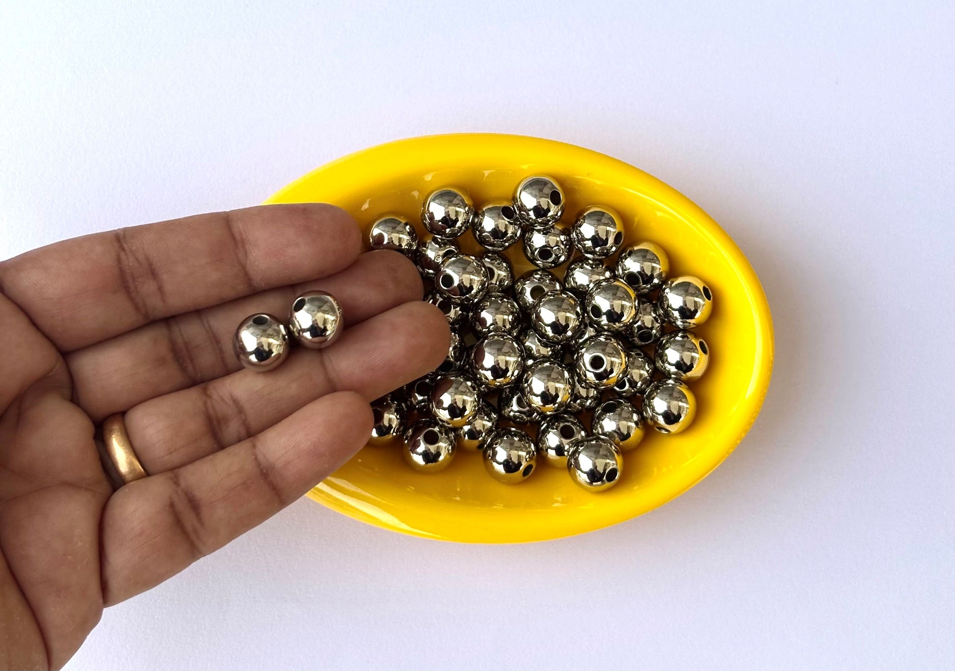 These shiny silver tone 10mm CCB round beads are perfect for adding a lightweight metallic accent to your necklaces, bracelets, and various jewelry designs. Pack of 25 grams.