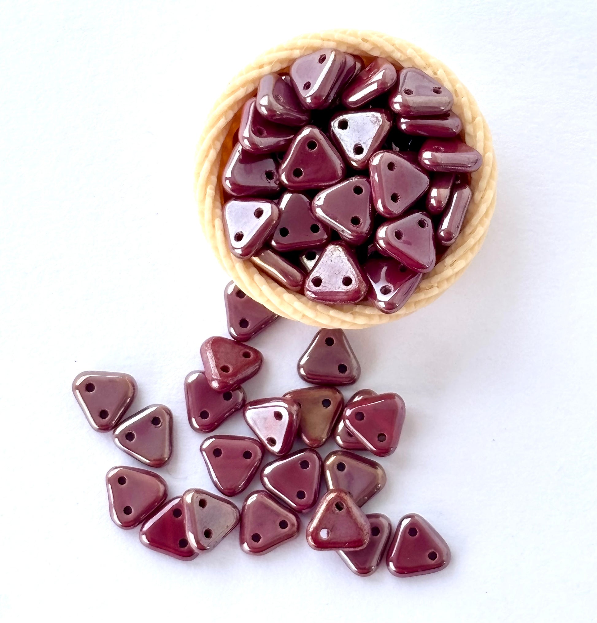Discover rich maroon two-hole triangle beads, perfect for creating unique geometric patterns and adding sophisticated color to your jewelry designs. Size 5MM. Pack of 10 grams with 72 beads approximately.