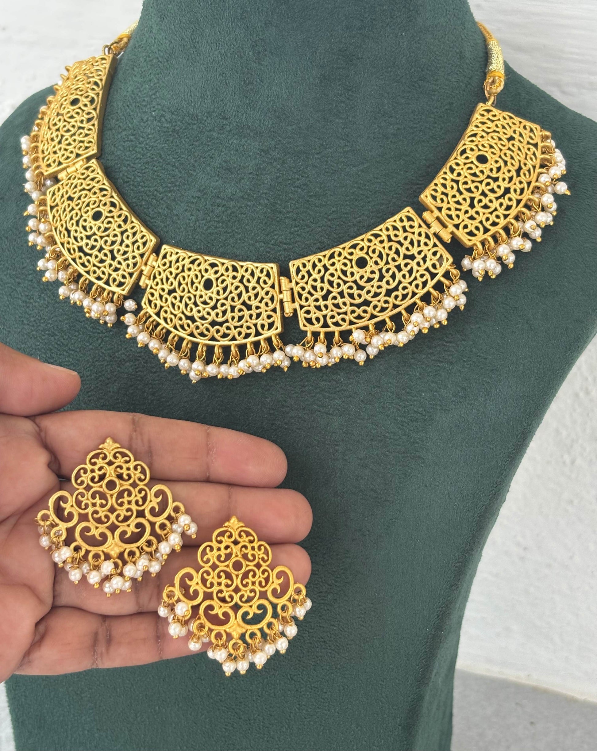 Matte Gold Jali Work Choker Necklace Set