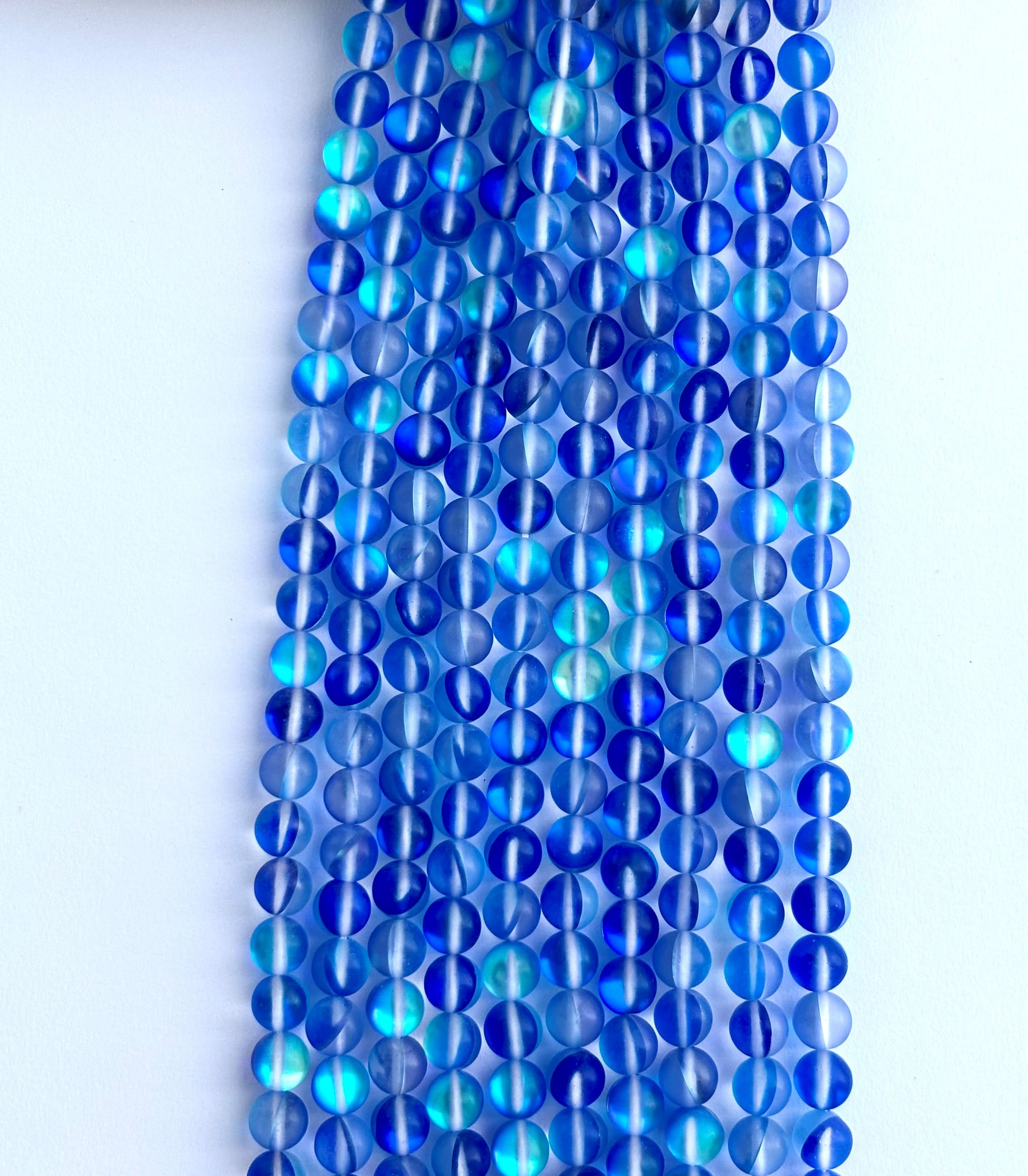 Make a bold statement with these electrifying matte royal blue aura quartz beads, perfect for unique jewelry designs. Size 8 mm. Sold as a single strand containing 45 beads approximately.