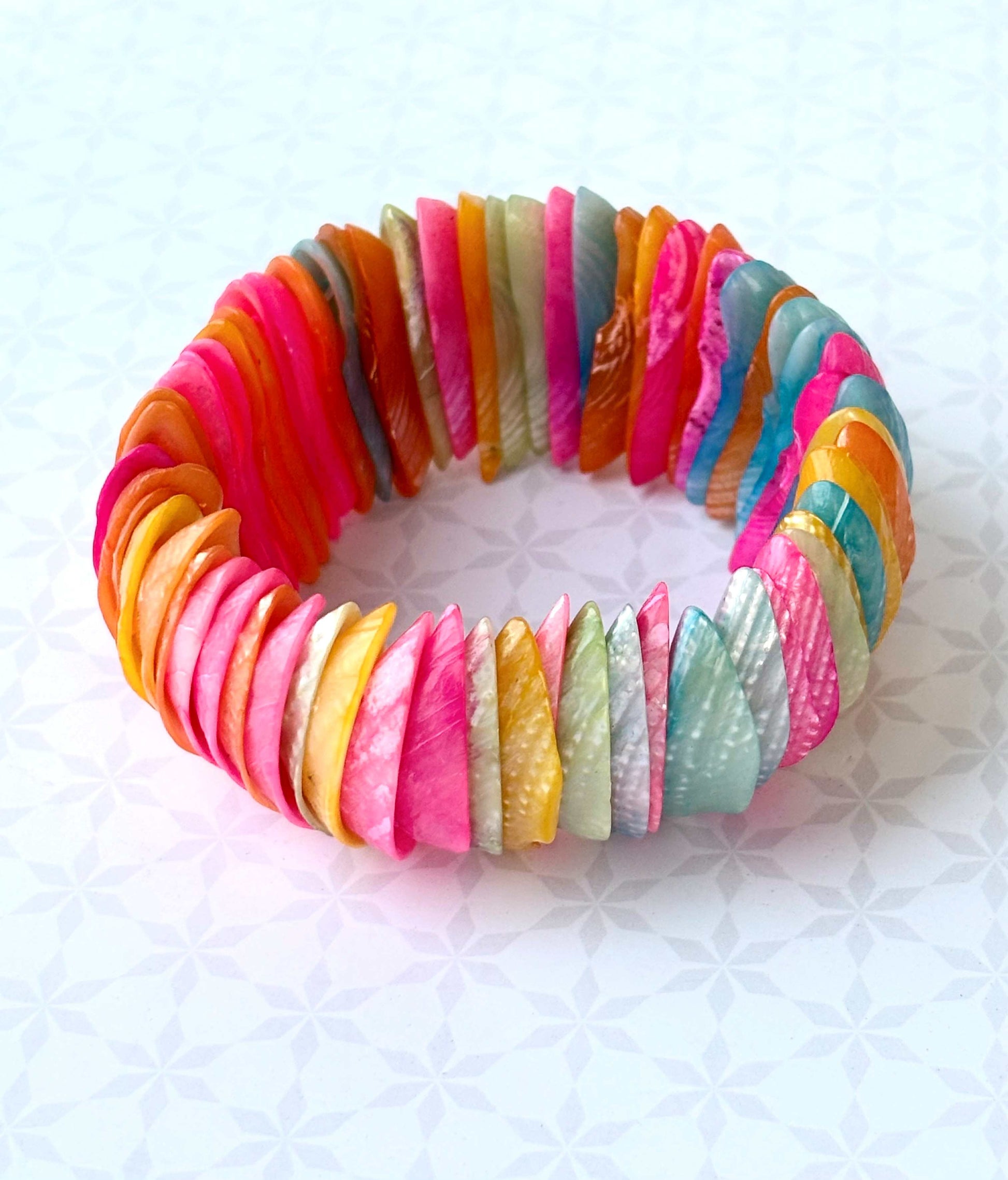 A chunky, colorful stretch bracelet made with polished flat Mother of Pearl shell discs. Sold as a single piece. Free size. Strechable elastic string used.