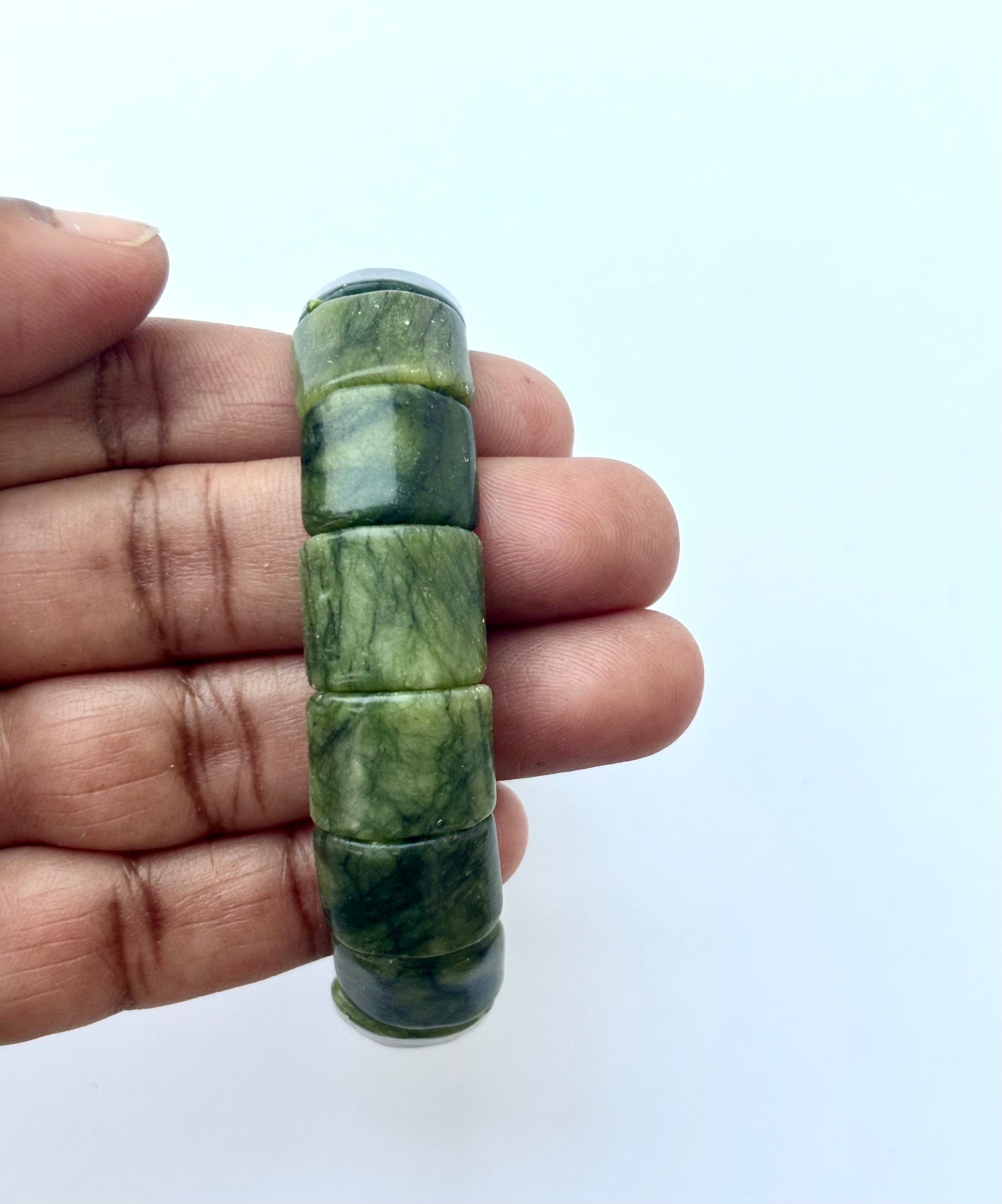 Attract harmony and protection with this deep green gemstone bracelet featuring faceted rectangular beads of Natural Jade. Sold as a single piece. Free Size. Bracelet made with strong elastic.