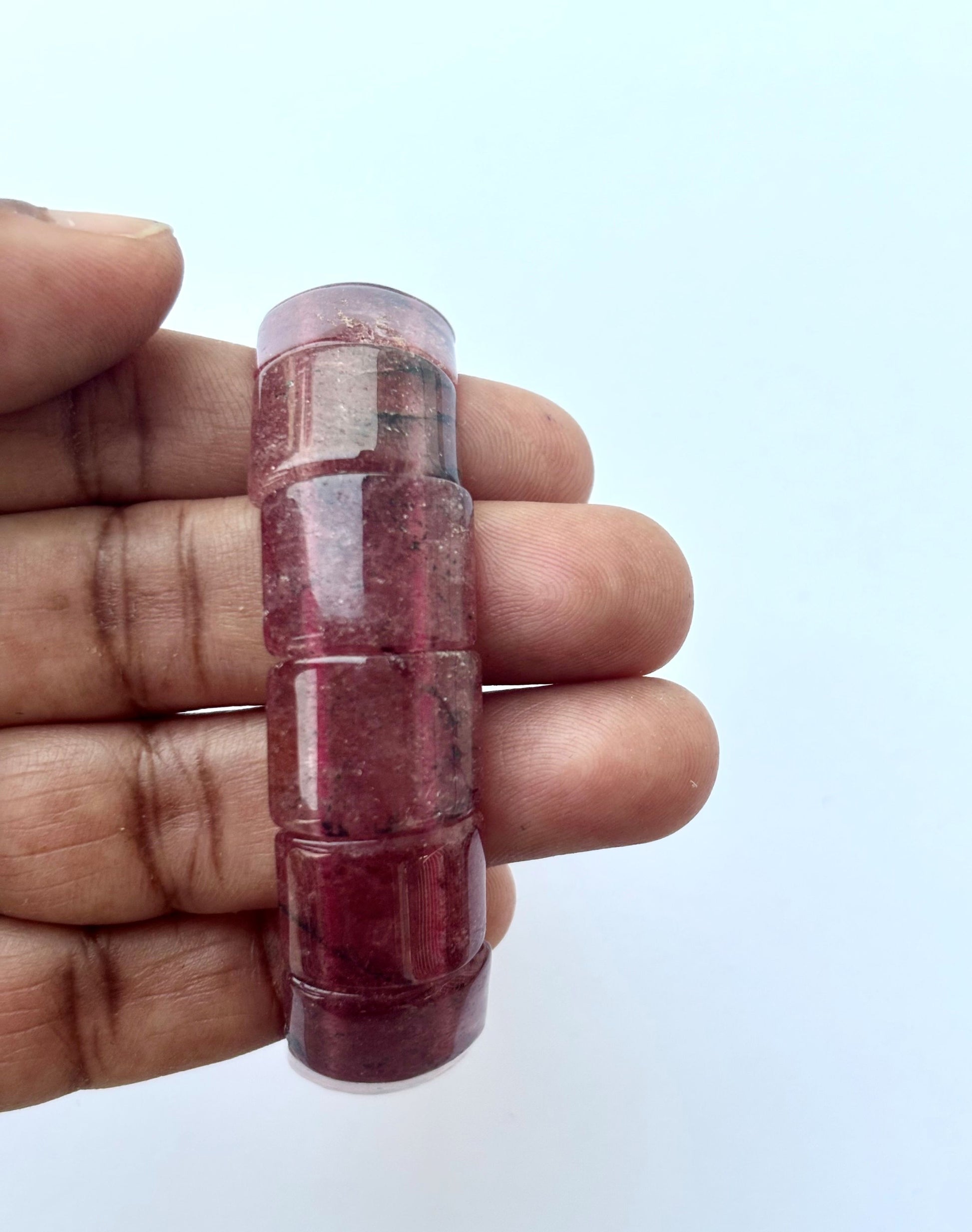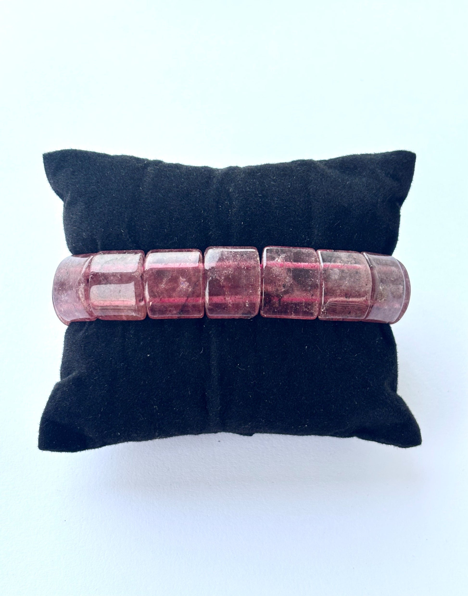 Infuse your look with warmth using this handcrafted bracelet featuring translucent, faceted rectangular beads of Strawberry Quartz. Sold as a single piece. Free Size. Bracelet made with strong elastic.