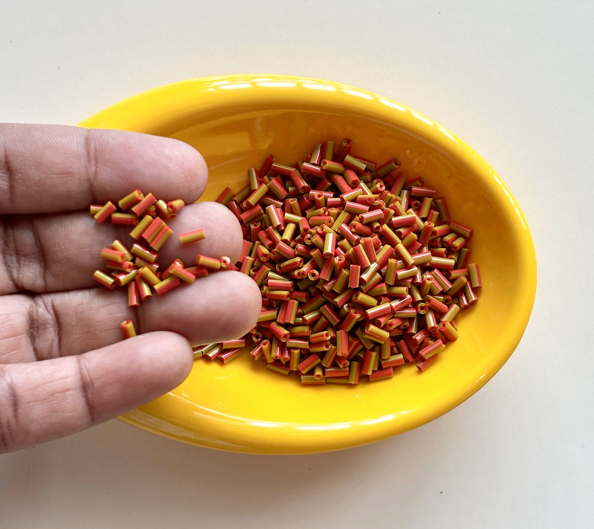 Discover vibrant striped glass beads, perfect for jewelry making, crafts, and DIY projects. These beads feature stunning olive green and red tones for eye-catching designs. Pack of 20 grams.