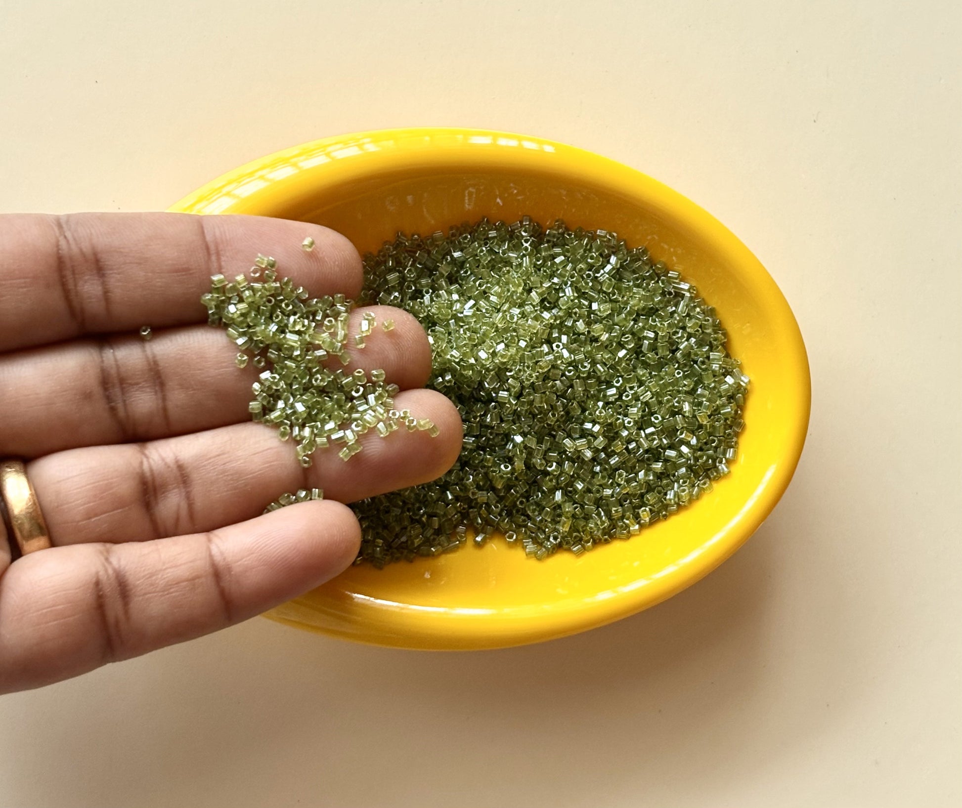 Discover premium-quality iridescent hex cut seed beads in a stunning Olive Green luster finish. Pack of 20 grams. Size 15/0.