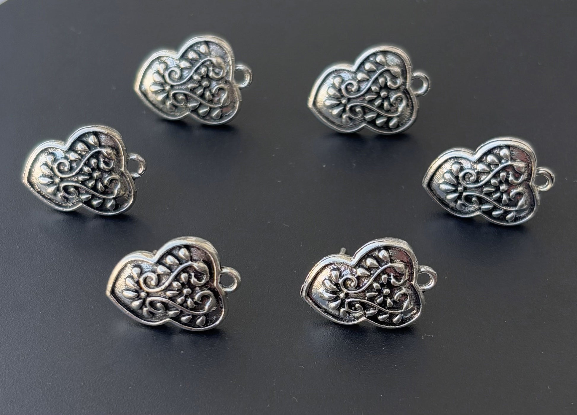 Adorn your creations with these beautiful ornate heart-shaped studs or charms featuring intricate filigree patterns. Pack of three pairs.
