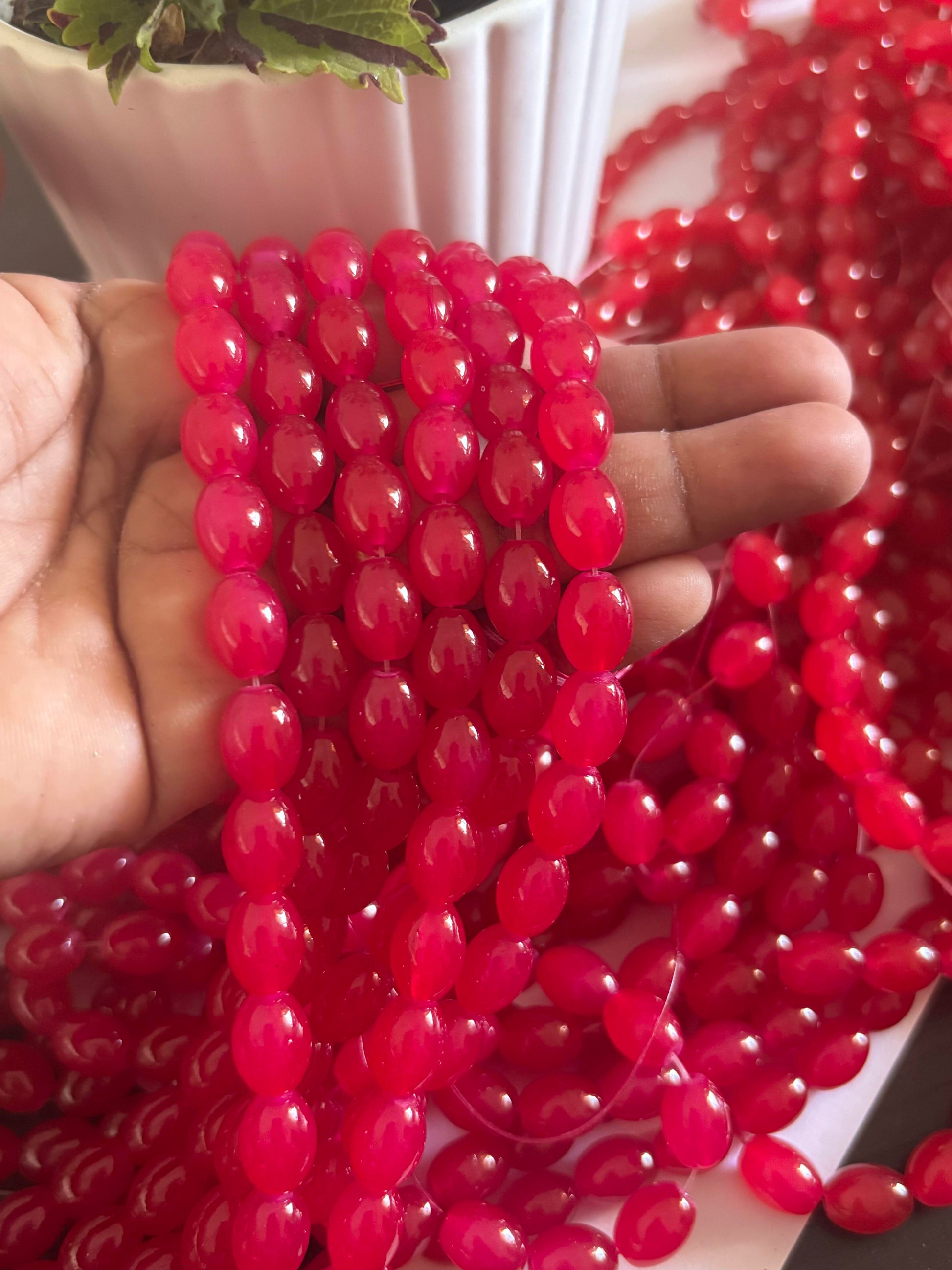 Discover enchanting smooth oval ruby pink glass beads, perfect for elegant jewelry designs. Size 10X7 MM. Length 15 inches.