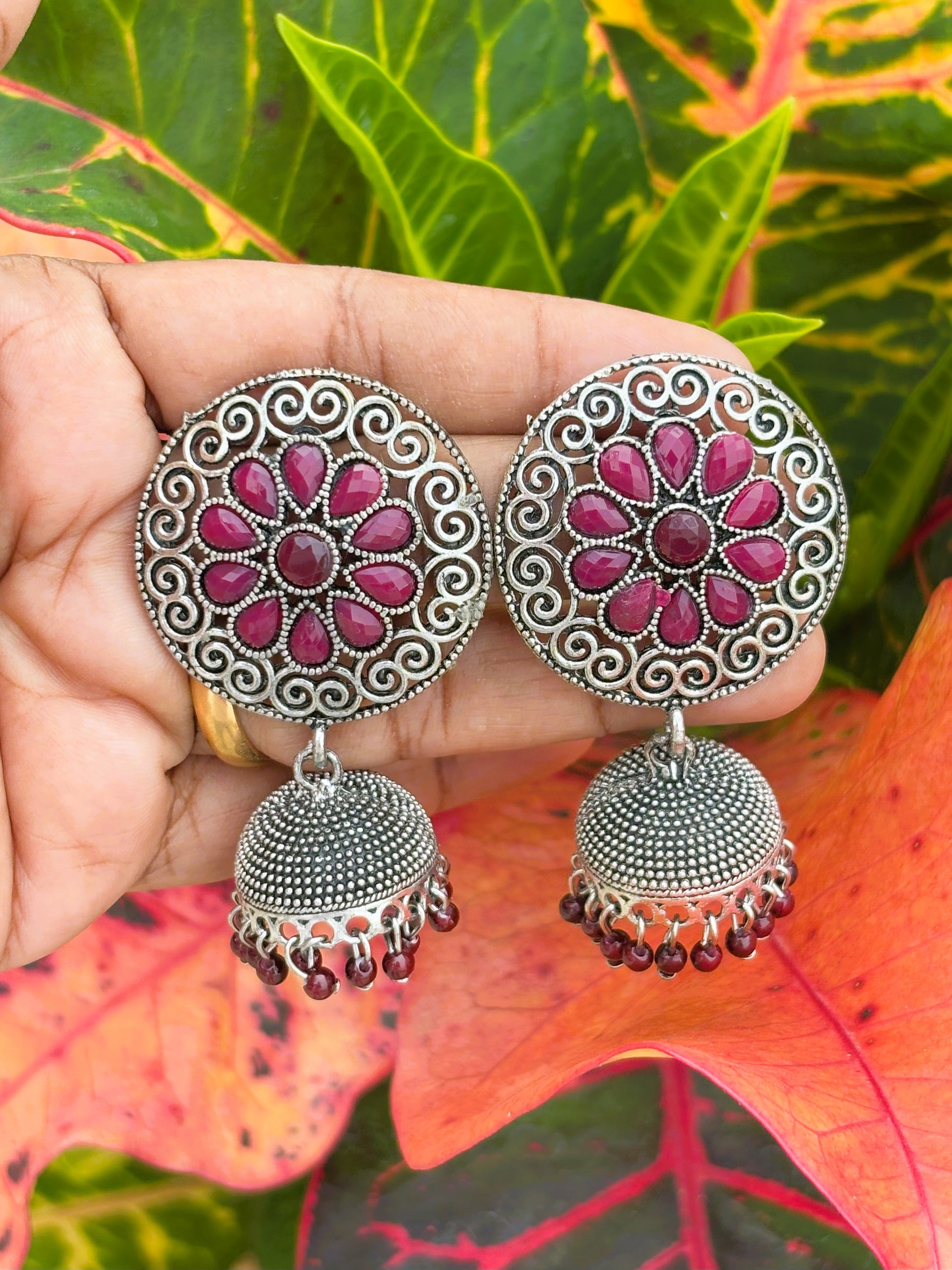 These oxidized jhumkas feature a large, intricate floral stud with ruby-colored stones and a dangling bell with a delicate fringe of matching beads. Sold as a single pair.