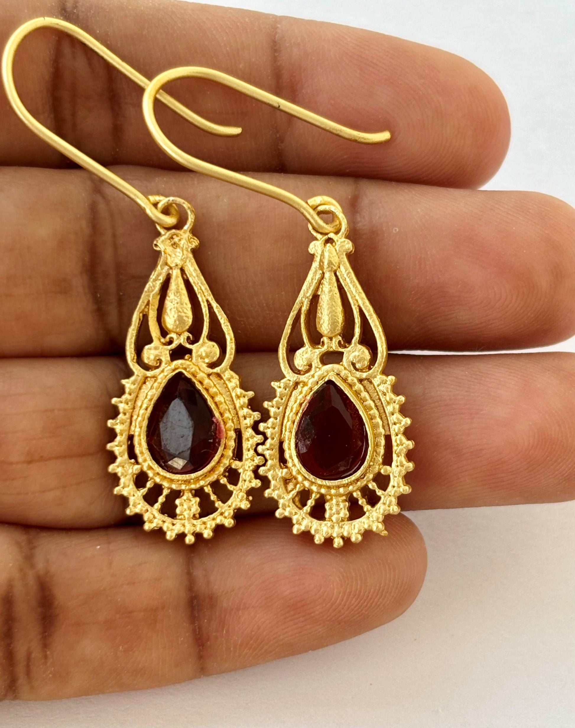 Elegant oxidized gold-tone earrings with an intricate teardrop design and a deep red garnet-colored stone. Sold as a single pair.