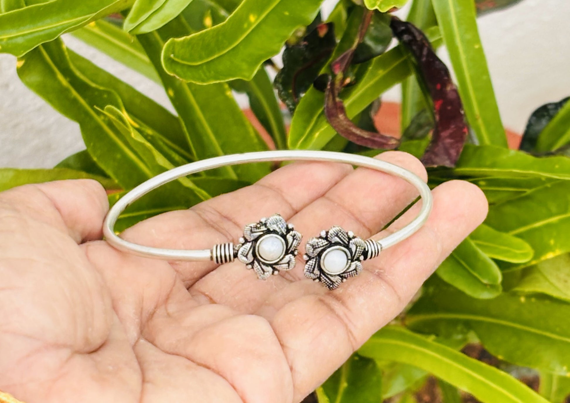 Elevate your style with this elegant oxidized silver cuff bracelet, featuring two intricate flowers centered with luminous pearl. Sold as a single piece. Free Size.
