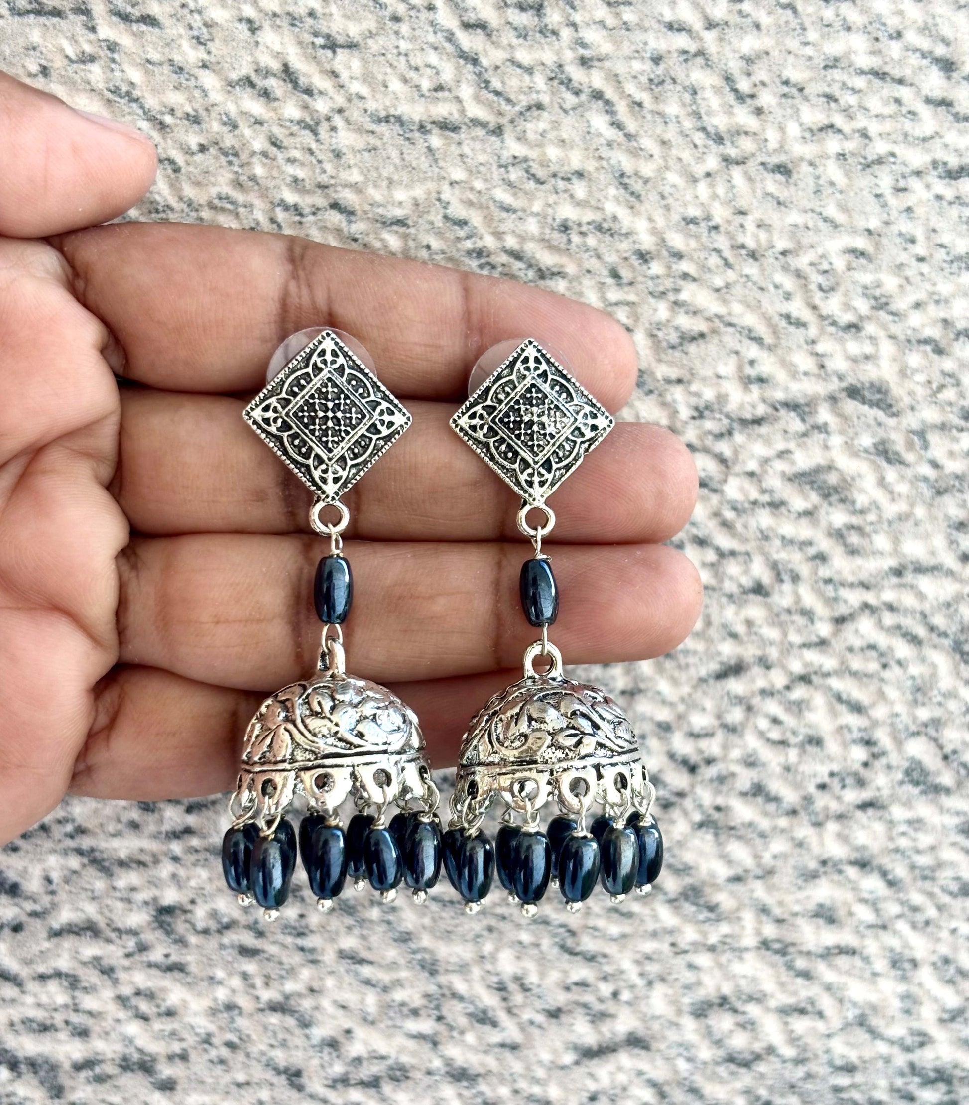These handcrafted earrings feature a detailed diamond-shaped stud in an oxidized silver finish with a bell-shaped dangle adorned with navy blue beads. Sold as a single pair.