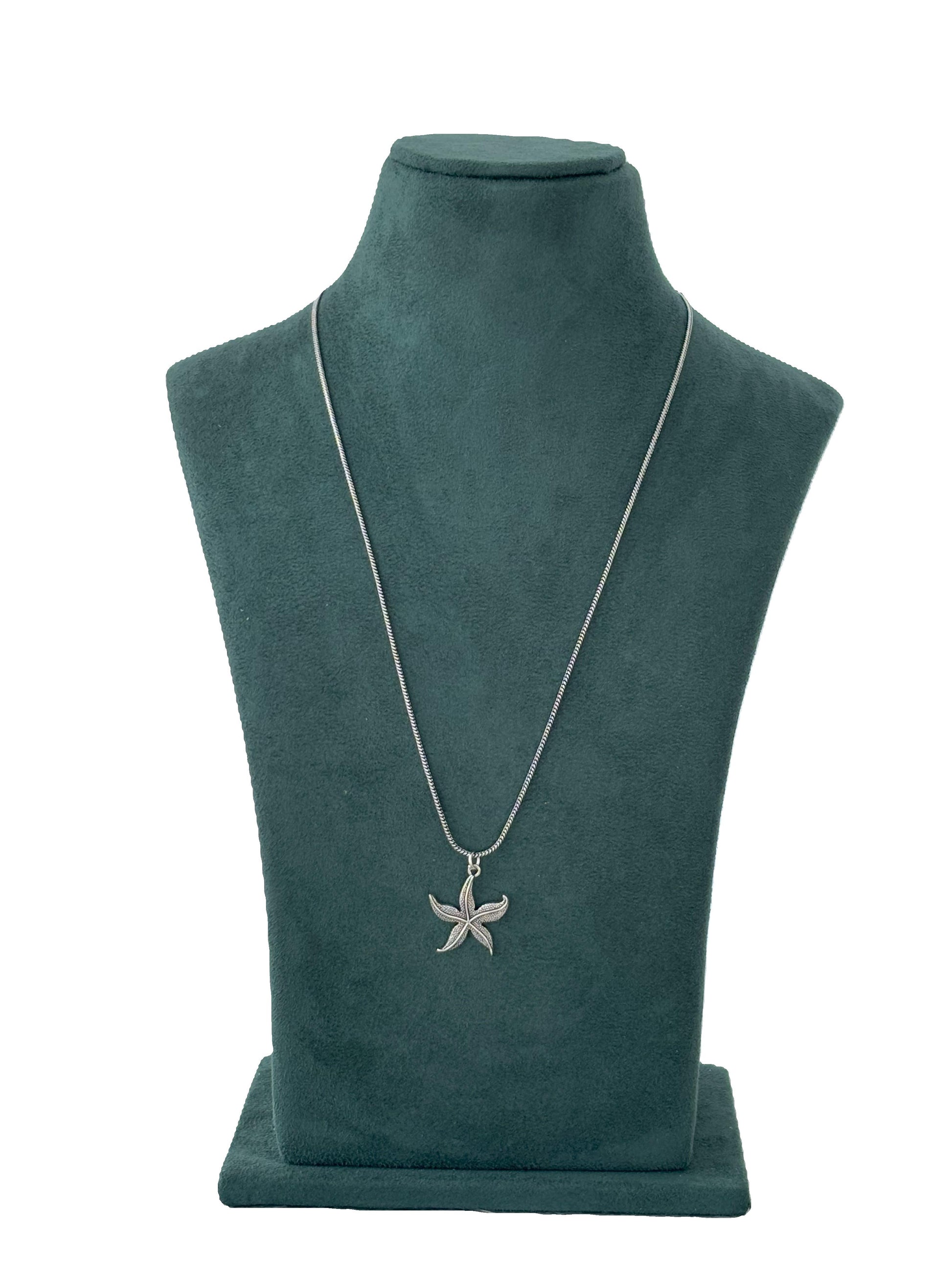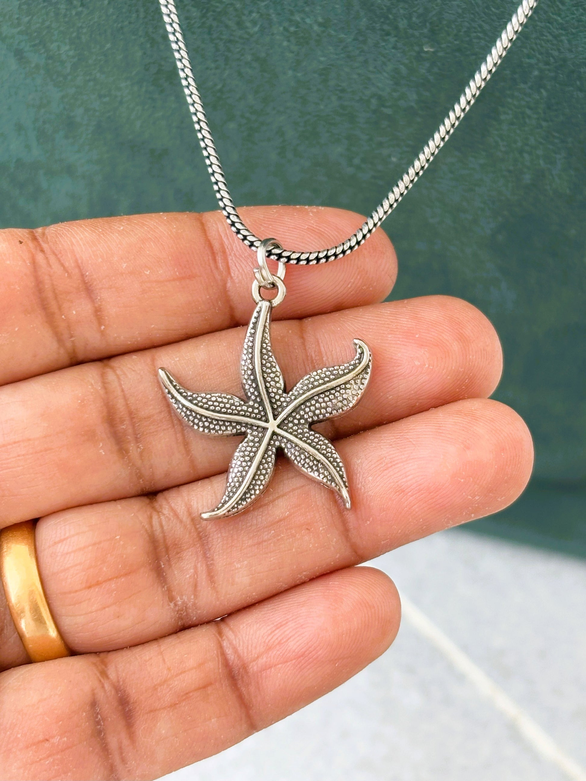 A charming oxidized silver necklace featuring a detailed starfish pendant, perfect for a subtle beach-inspired or nautical look. Sold as a single piece. Chain length 18.5 inches in total. Pendant height 1 inch.