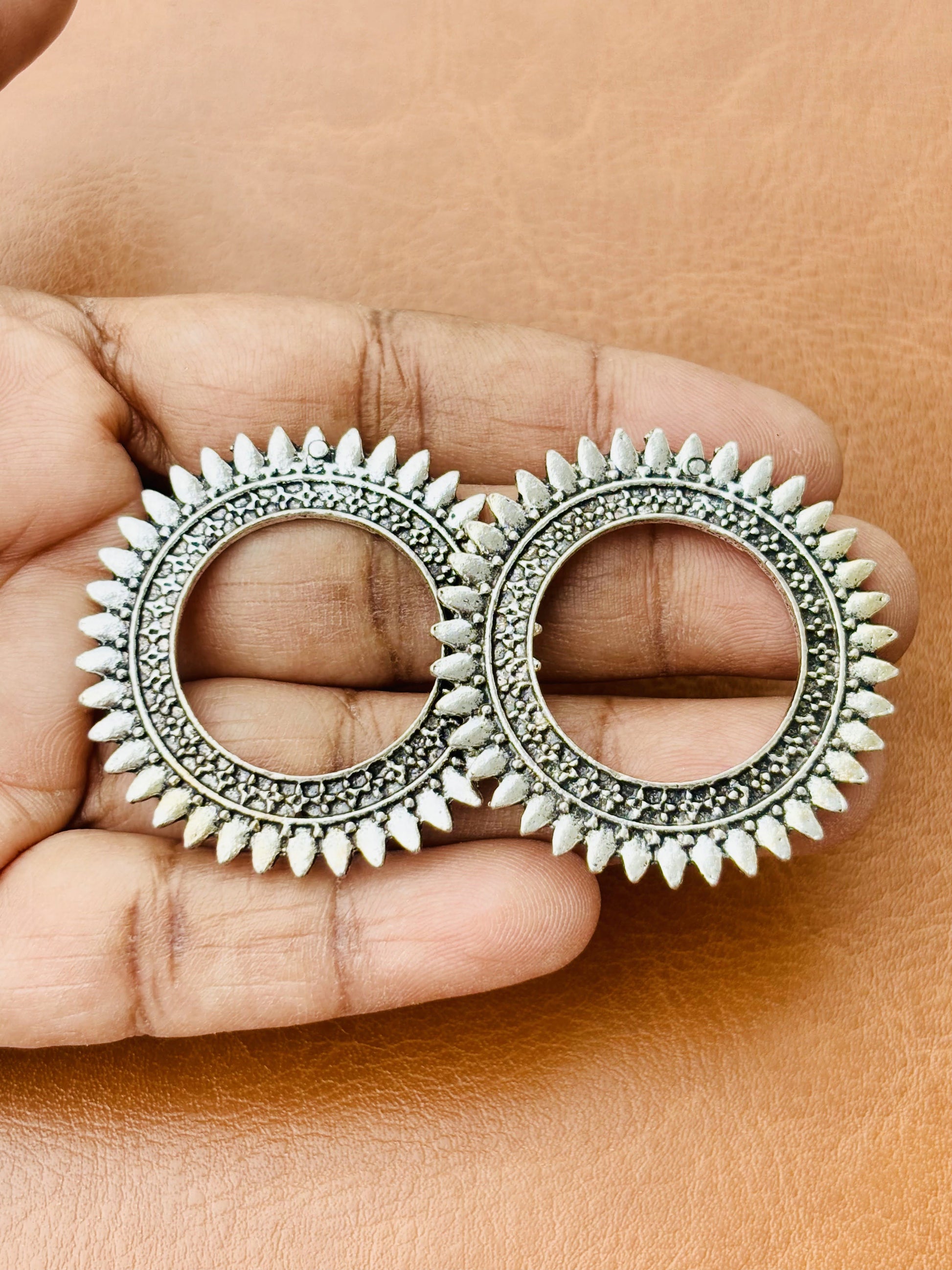 Craft unique bohemian earrings with these striking oxidized silver sun-shaped metal studs. Perfect for jewelry makers and DIY enthusiasts. Sold as a single pair.