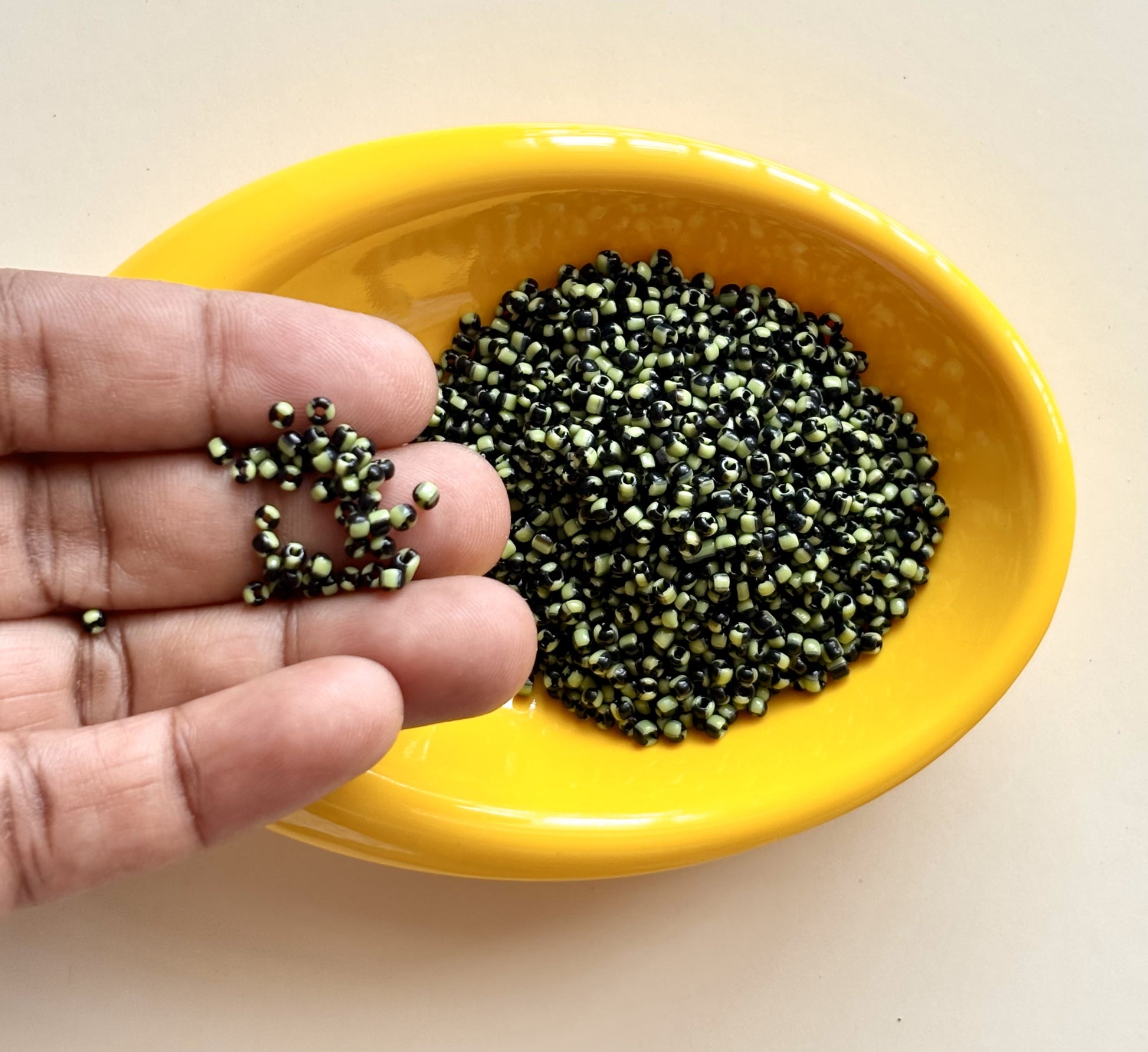 High-quality pastel green and black two tone seed beads perfect for DIY jewelry, beading, and crafting projects. These vibrant, precision-cut glass beads add a unique touch to your handmade creations. Pack of 30 grams. Size 11/0.