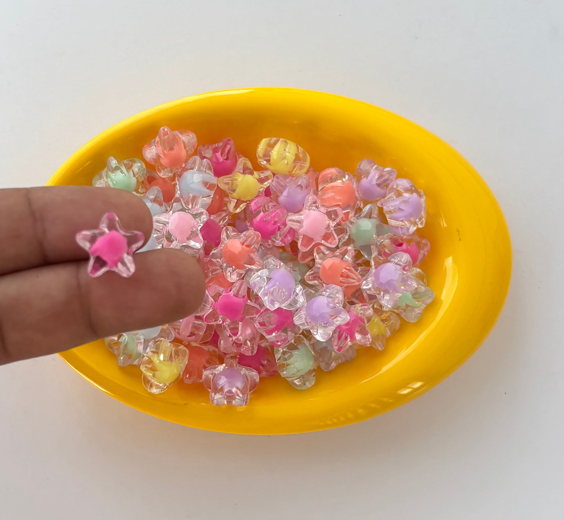 Discover a delightful assortment of translucent, star-shaped beads in soft pastel colors, perfect for adding a whimsical touch to DIY jewelry, bracelets, kid's crafts, party favors, and other creative projects. Pack contains 27 beads approximately.