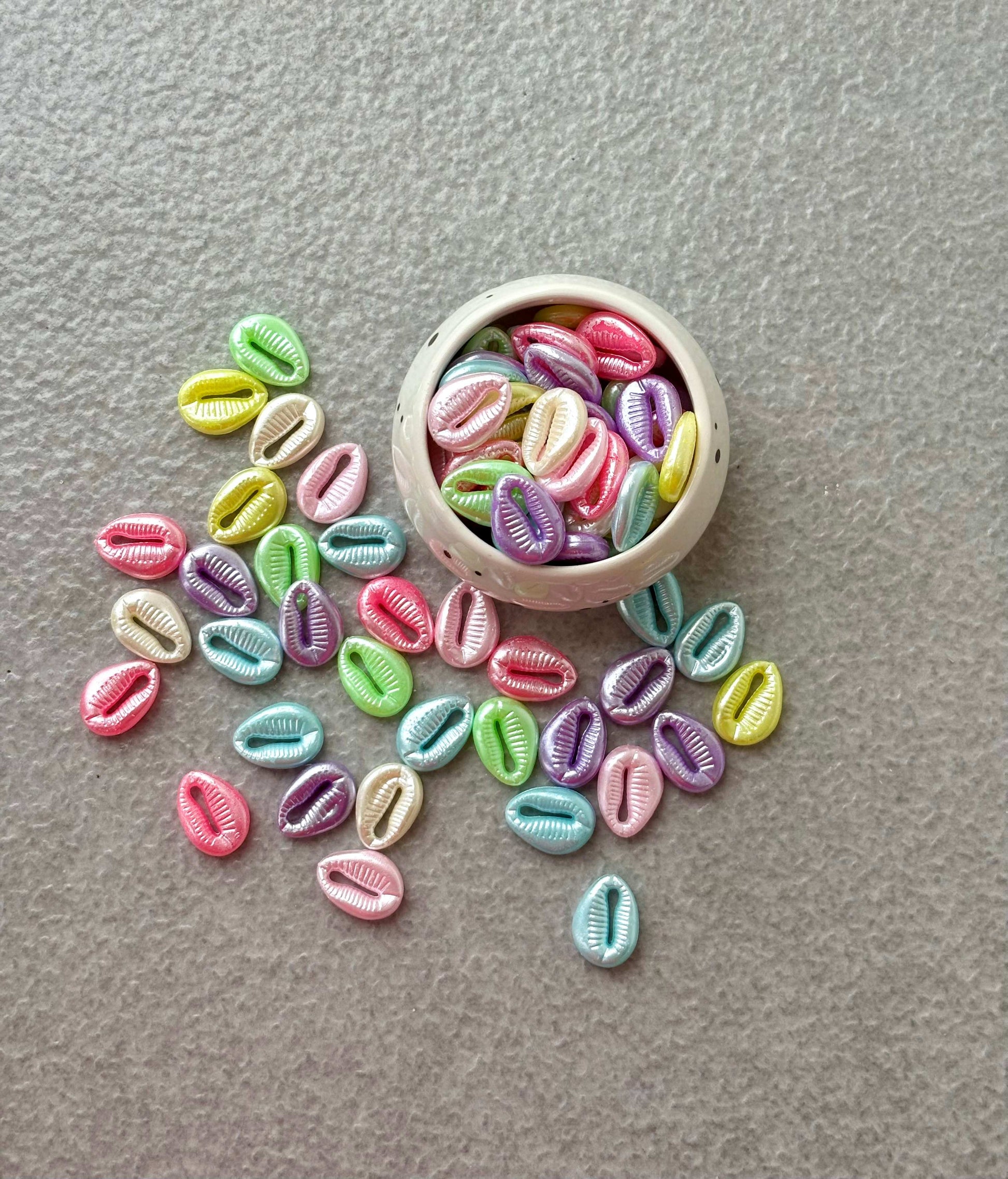 Shimmering imitation cowrie shell beads in mixed pastels, perfect for summer beach-themed bracelets and crafts. Pack of 10 grams random mix beads. Approximately 16 beads.
