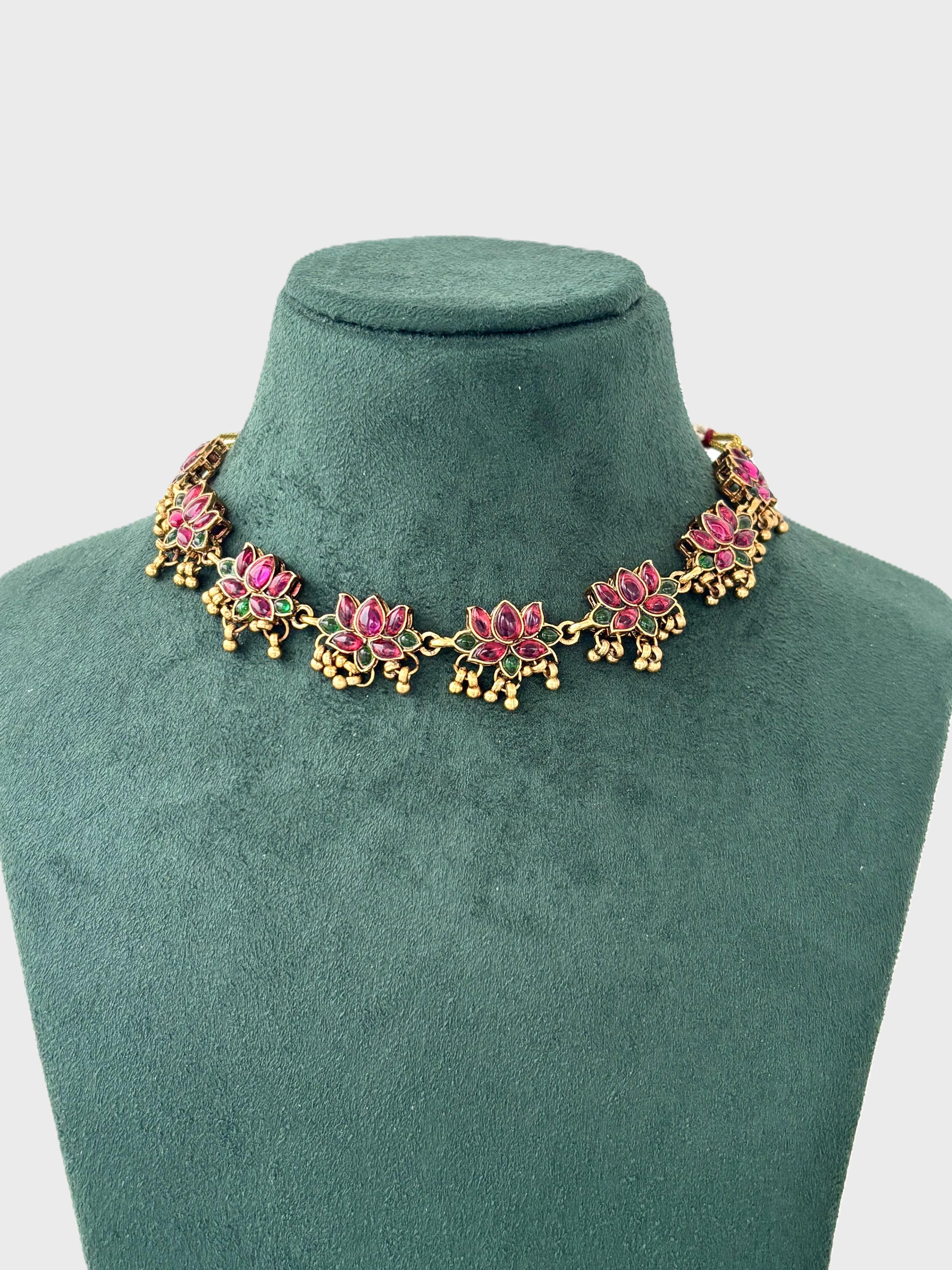 Pink and Green Lotus Kundan Necklace