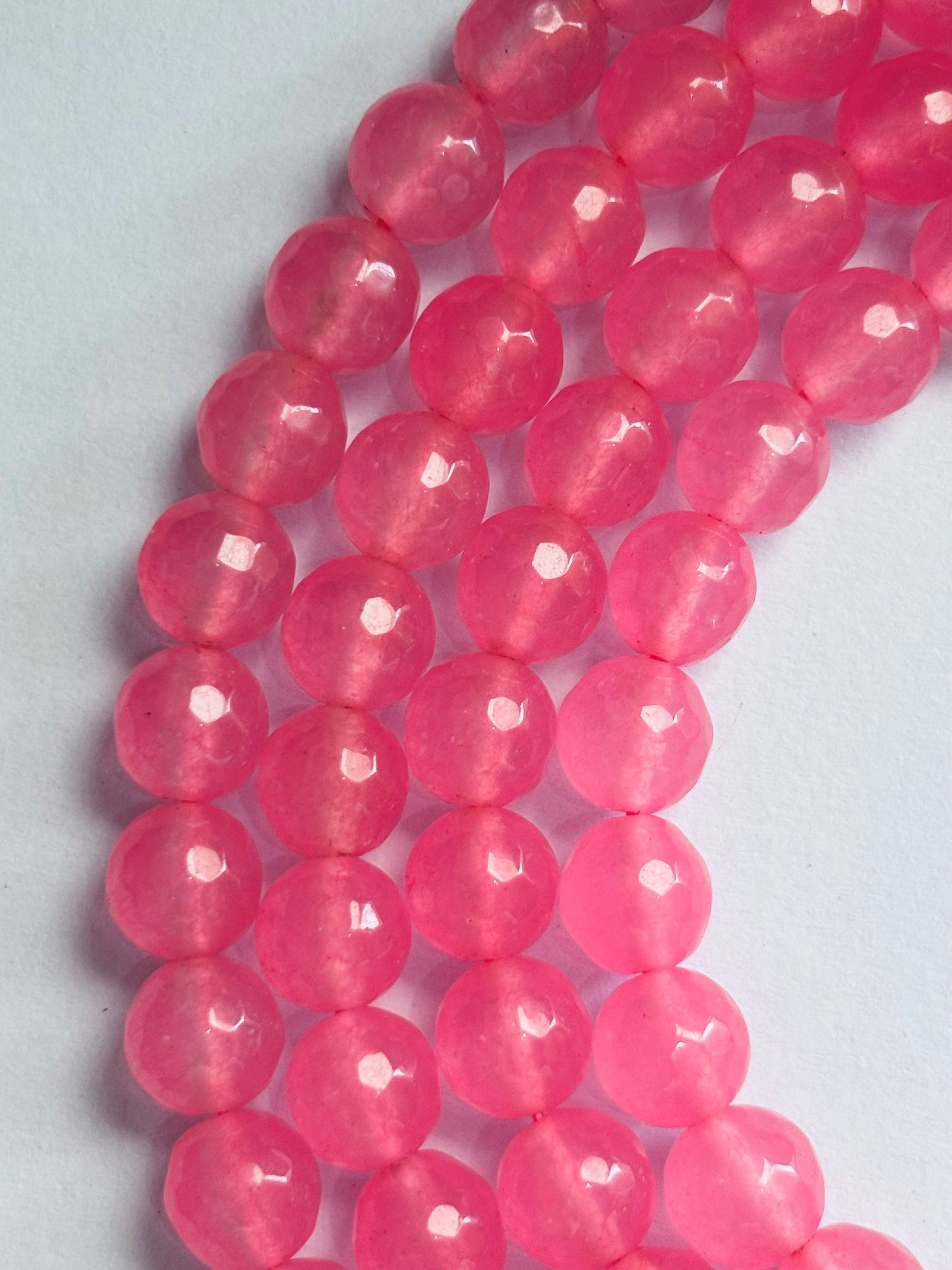 Discover vibrant pink jade faceted round beads, perfect for crafting colorful necklaces, bracelets, and earrings with natural charm. Sold as single string measuring 15 inches with 48 beads approximately. Size 8MM.