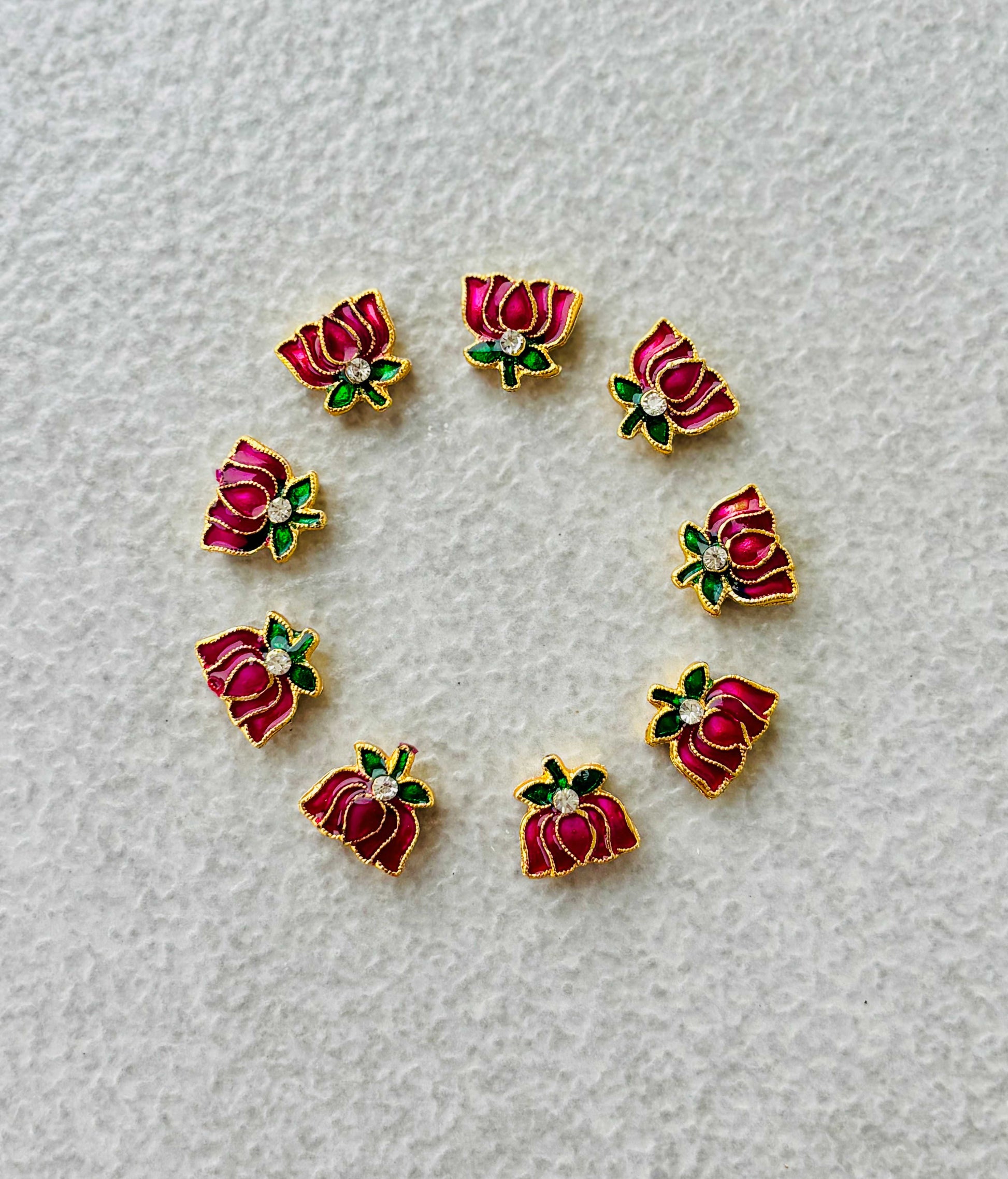 Exquisite pink enamel lotus motifs featuring green leaves and a central Kundan stone, perfect for traditional jewelry components. Sold as a single piece.