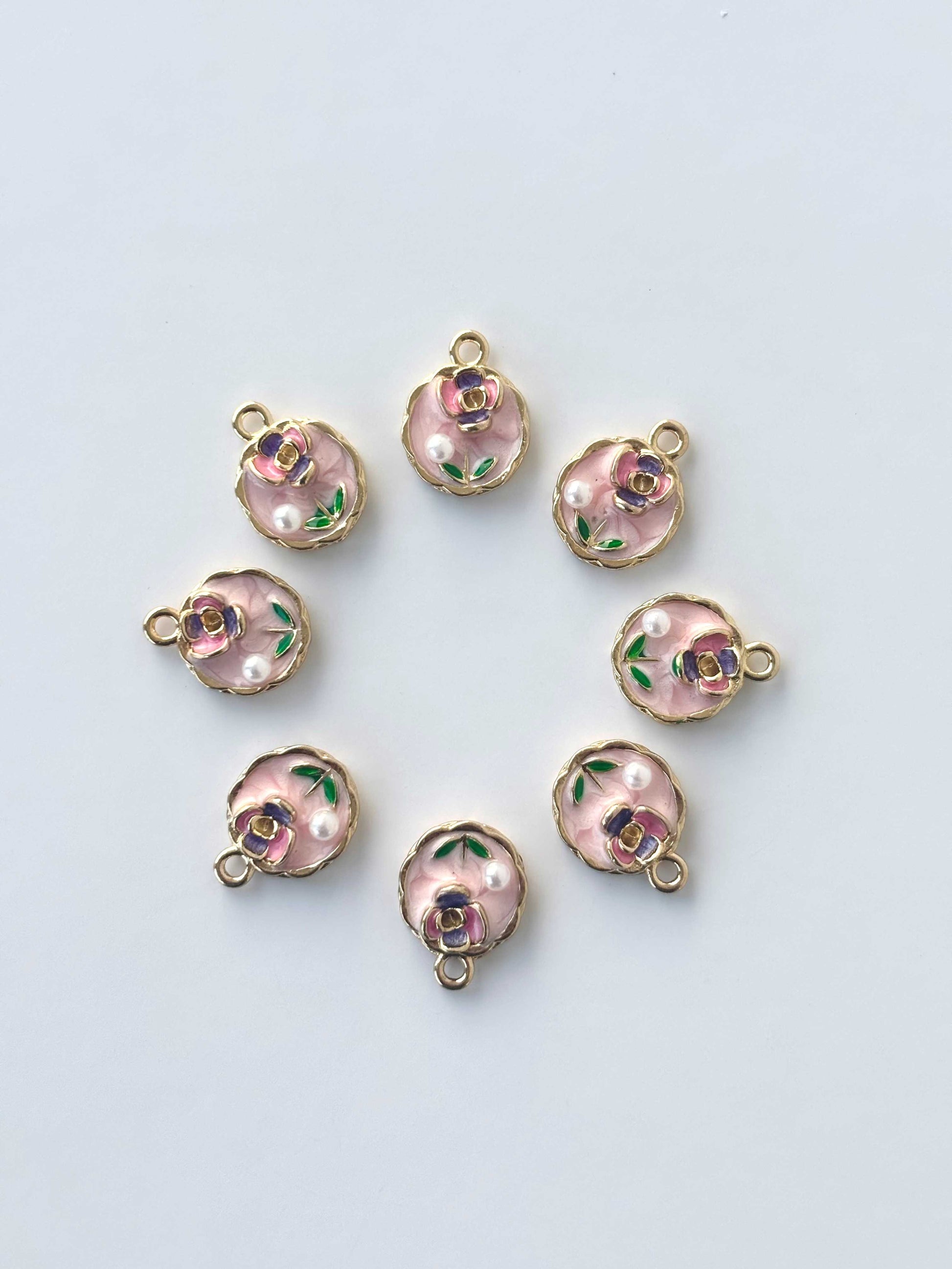 Pink enamel charms featuring a purple-accented rose, a delicate pearl, and a gold-scalloped edge for premium jewelry making. Pack of single charm.