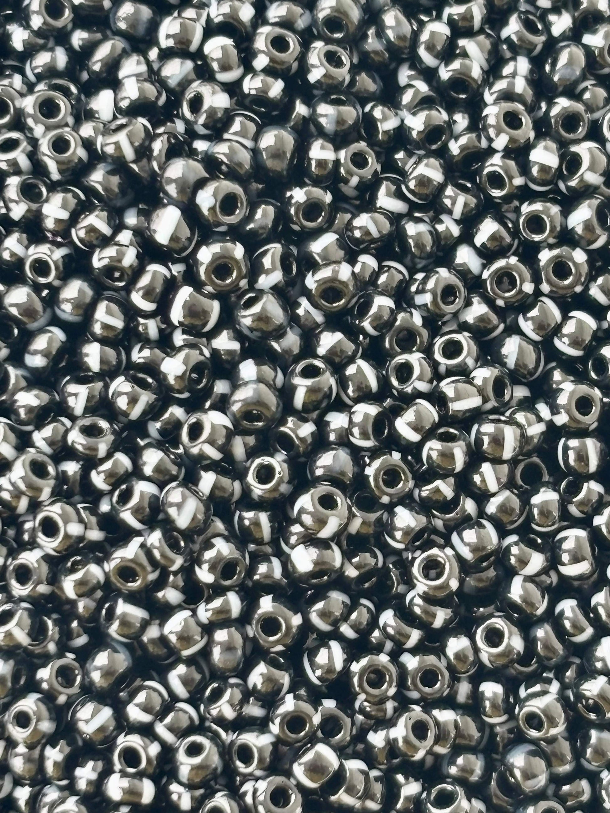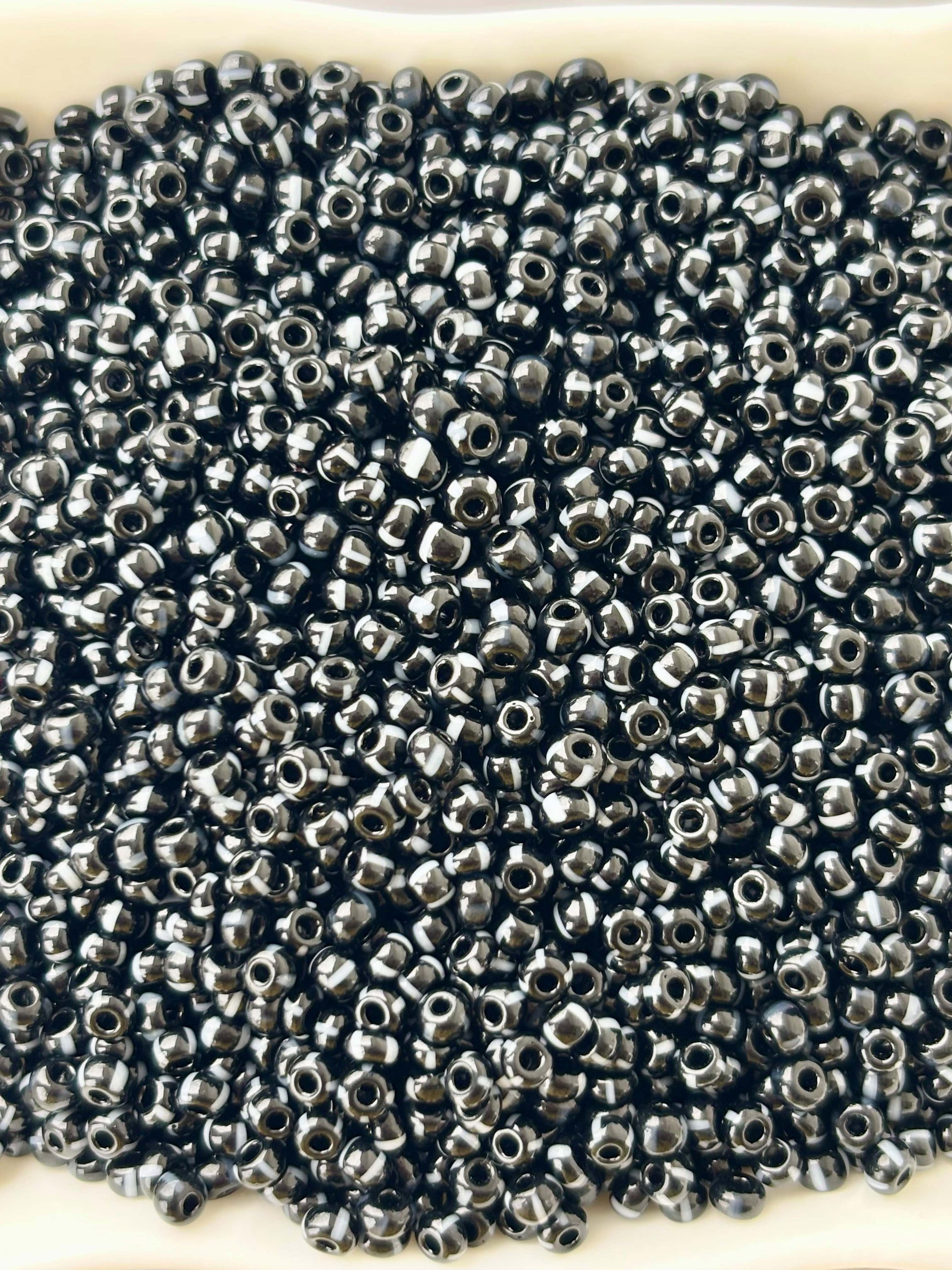 These striking Preciosa 8/0 Rocailles seed beads feature a black bead with white striped design, perfect for bold jewelry making, intricate bead weaving, and craft projects. Size 8/0. Pack of 9 grams.