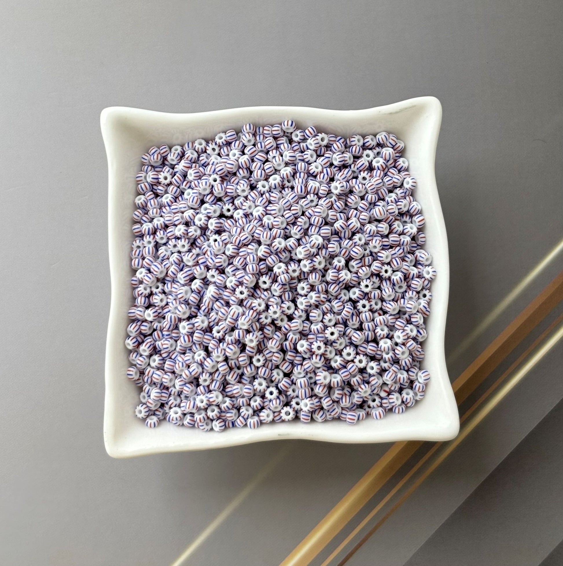 These patriotic Preciosa 8/0 Rocailles seed beads feature a white opaque base with vibrant blue and red stripes, perfect for themed jewelry, holiday crafts, and decorative projects. Size 8/0. Pack of 9 grams.