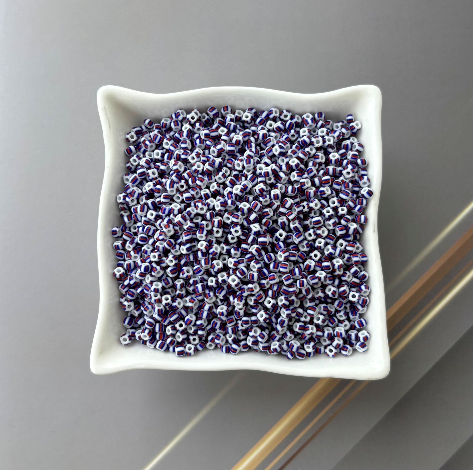 These vibrant Preciosa 8/0 Rocailles seed beads feature a white opaque base with bold blue and red stripes, perfect for patriotic themes, jewelry making, and decorative craft projects. Size 8/0. Pack of 9 grams.