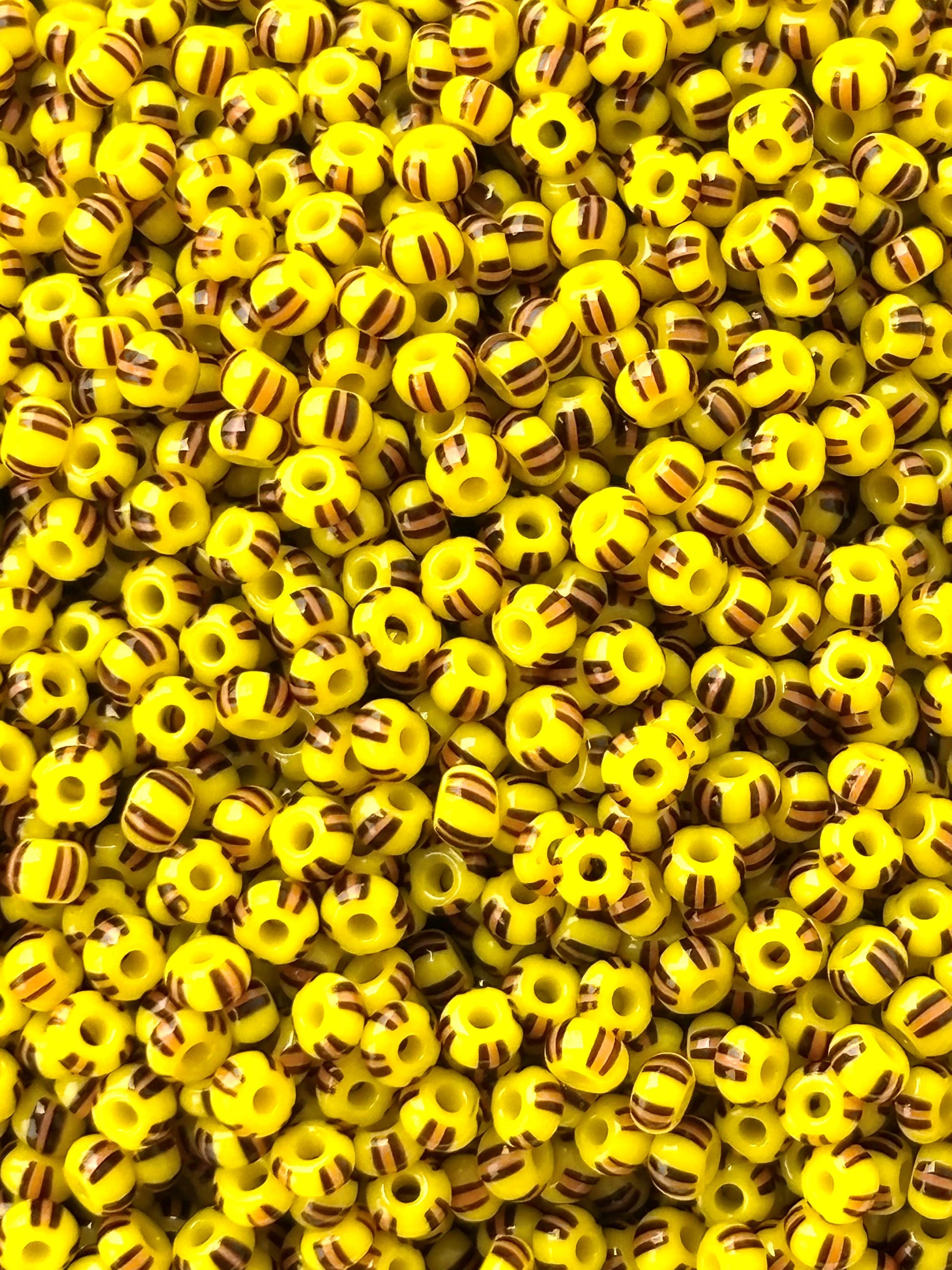 These playful Preciosa 8/0 Rocailles seed beads feature a bright yellow opaque base with brown stripes, perfect for creating bee-themed, animal print, or unique jewelry and craft projects. Size 8/0. Pack of 9 grams.