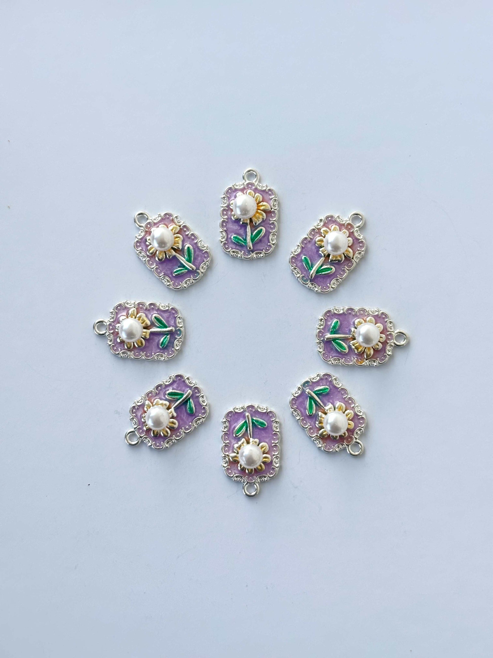 Exquisite rectangular purple enamel charms featuring a gold-tipped daisy, a central white pearl, and an intricate silver-toned scalloped frame. Pack of single charm.