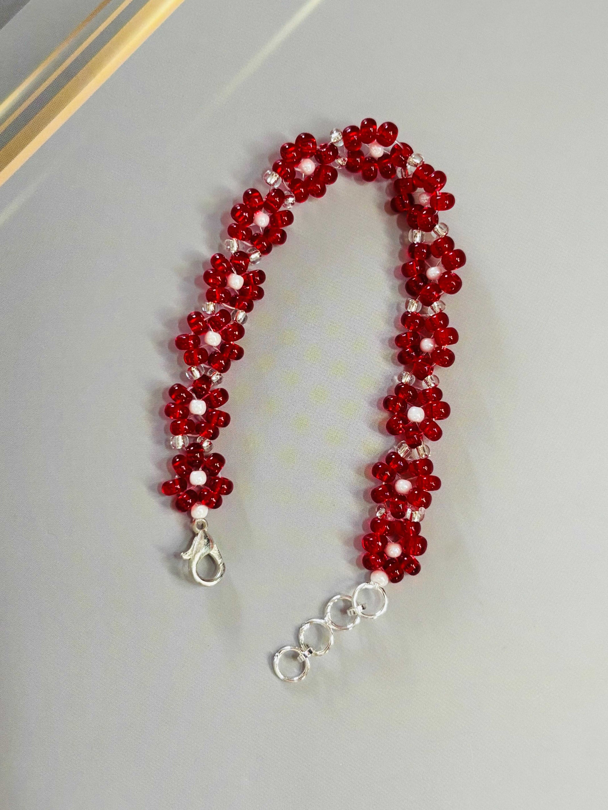 Hand-woven deep red flower bracelet featuring translucent beads and an adjustable silver-tone extension chain. Sold as a single piece. Sizes 7.5 inches.