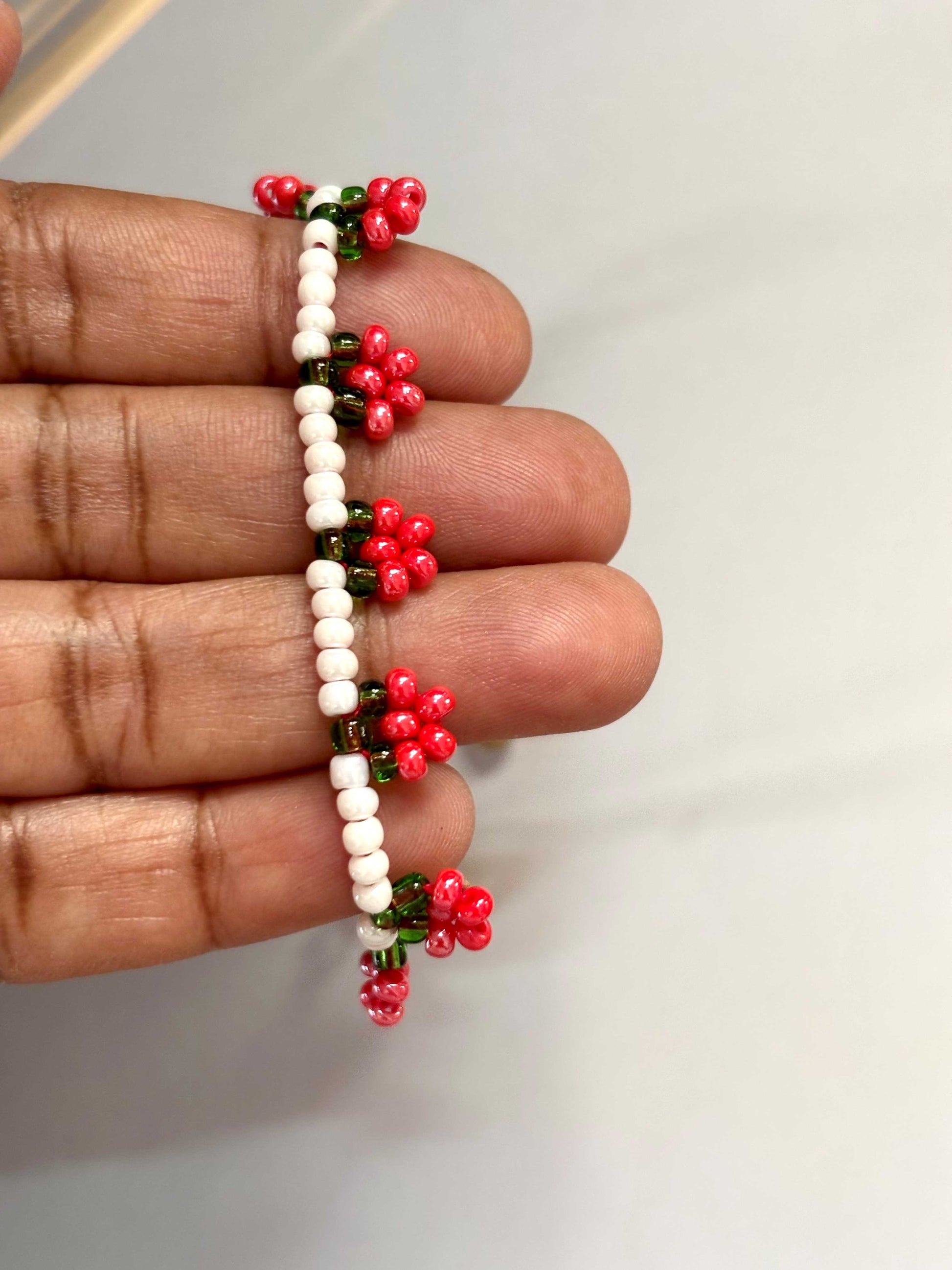 White seed bead bracelet featuring cute red flower motifs and an adjustable gold extension chain. Sold as a single piece. Sizes available 9 inches and 8.5 inches.